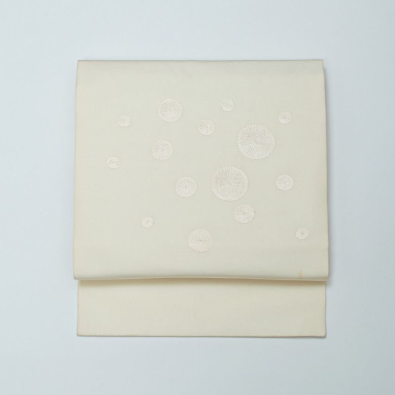 やさしいオフホワイト地に、精緻なサークル刺繍が施された塩瀬の名古屋帯です。