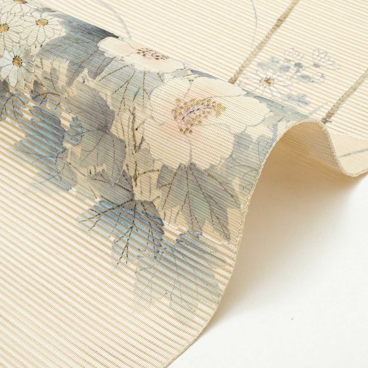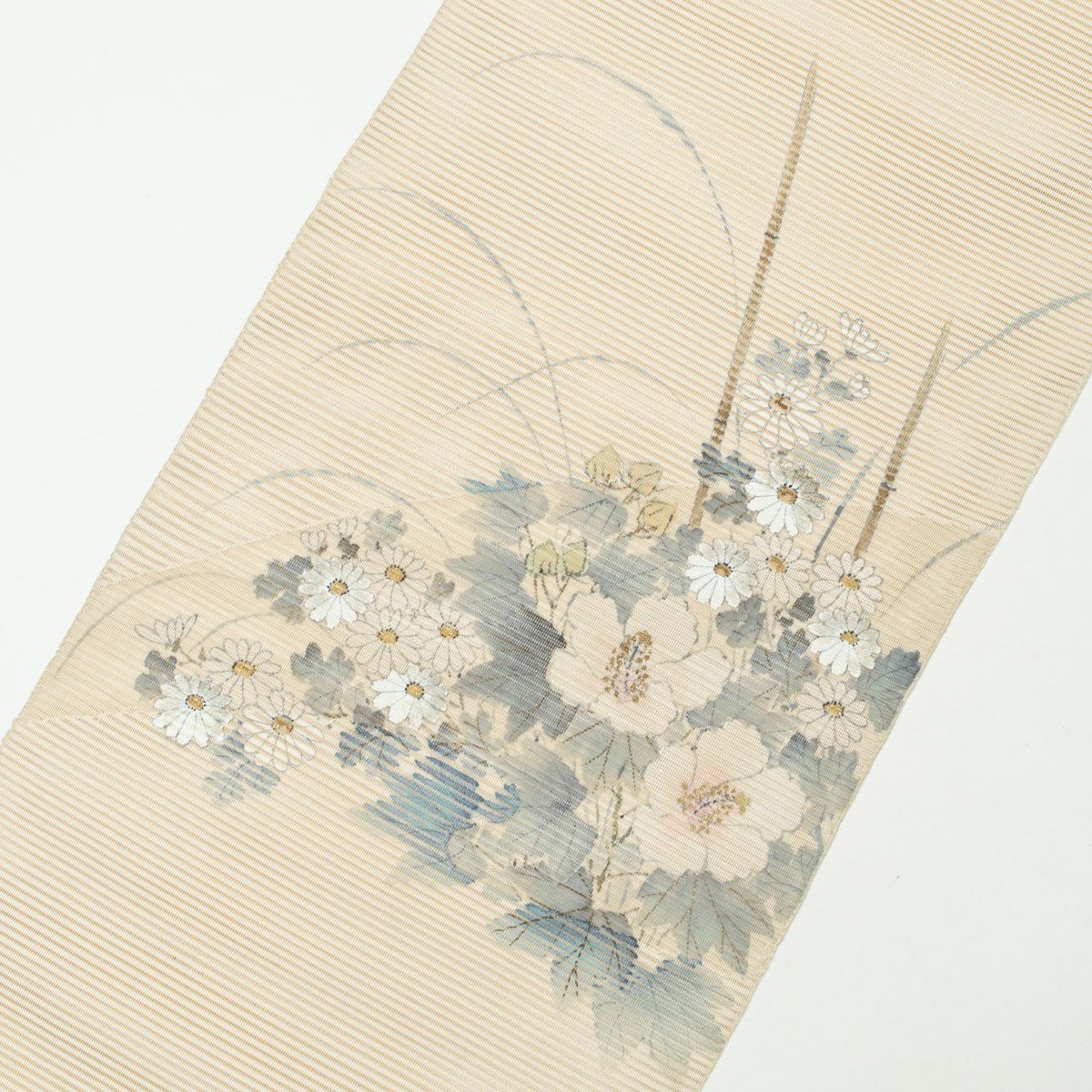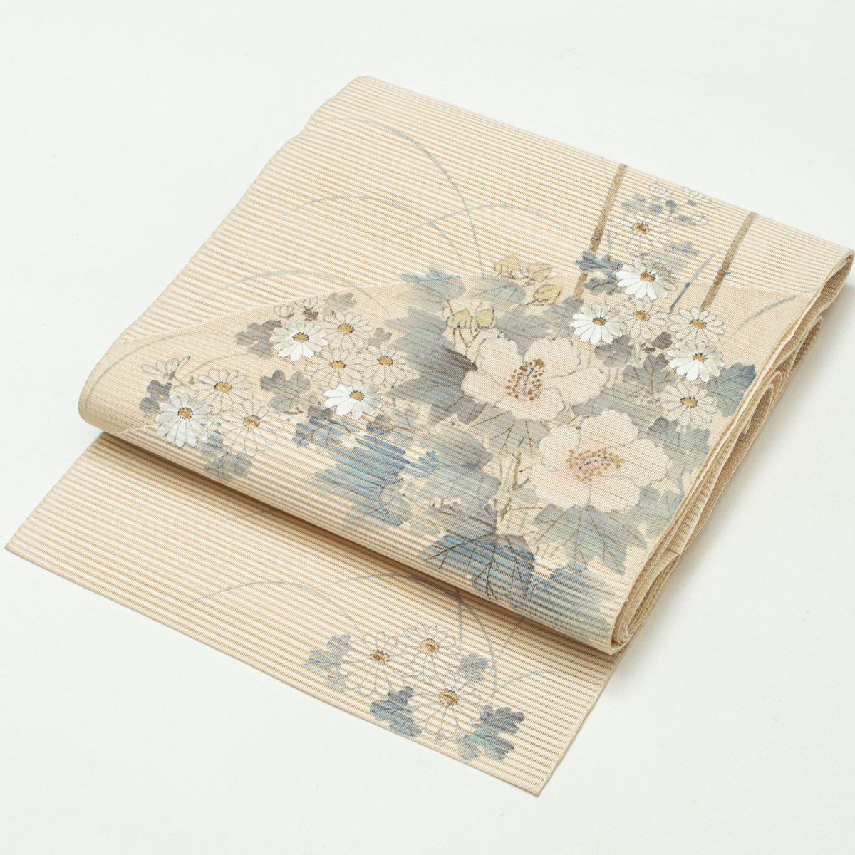他の画像を見る ★SALE40%OFF★開き名古屋帯 絽 手描き 芙蓉と菊 ライトベージュ 単衣・盛夏用 正絹 八寸 SALE 再マークダウン 定価 ¥ 16,500 のところ 当店特別価格 ¥ 9,900 税込 カートに入れる お気に入りに登録する