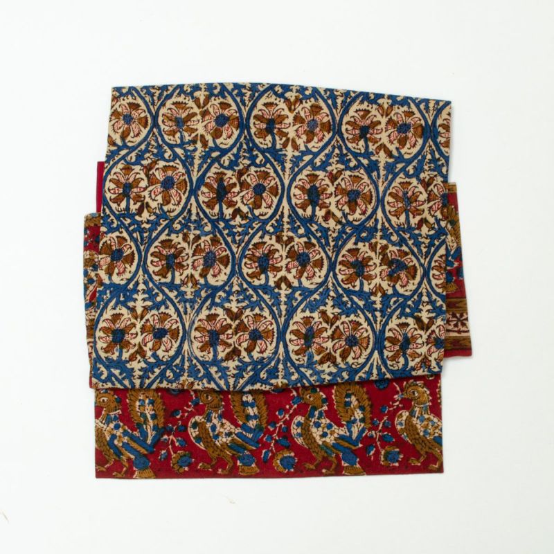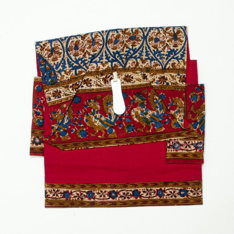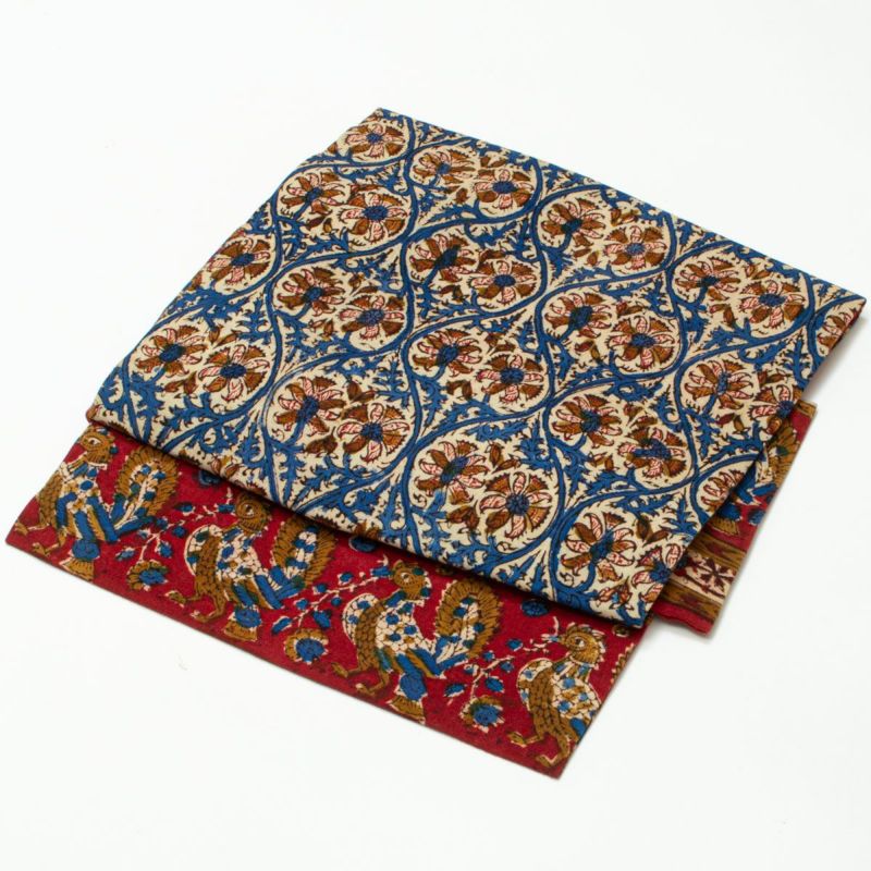赤地に彩り豊かな鳥や花が描かれた柄部分と、生成り地に青を効かせた文様部分のコントラストが魅力的。