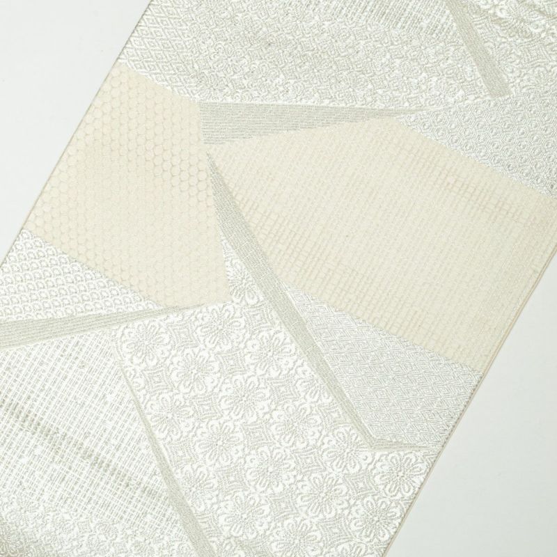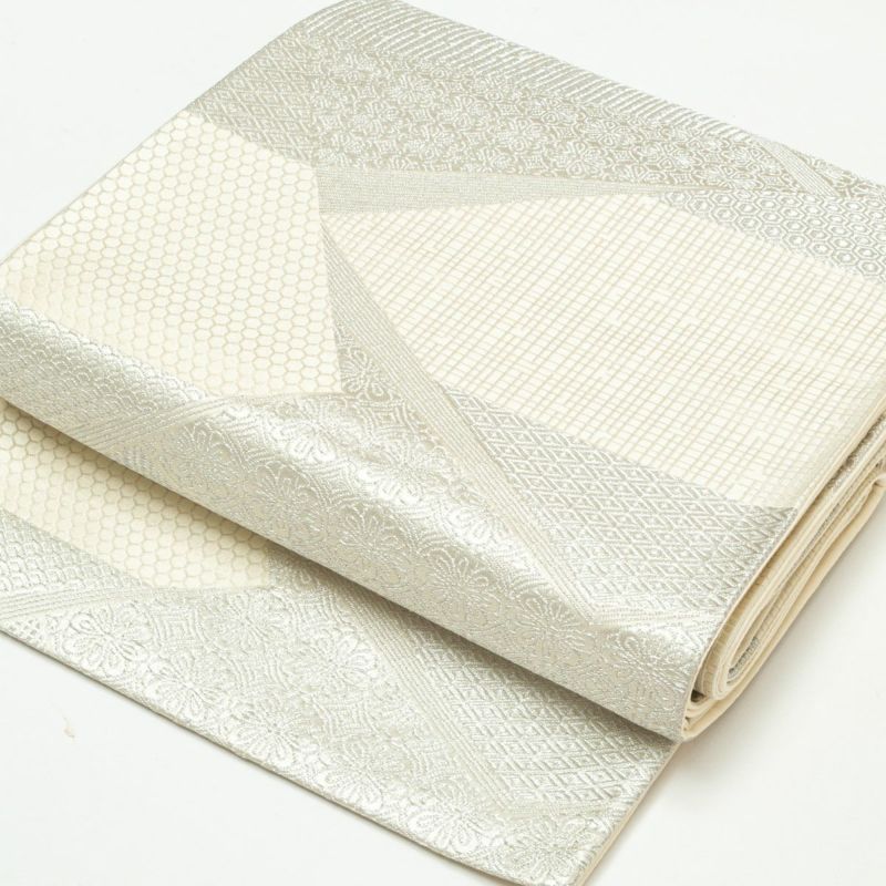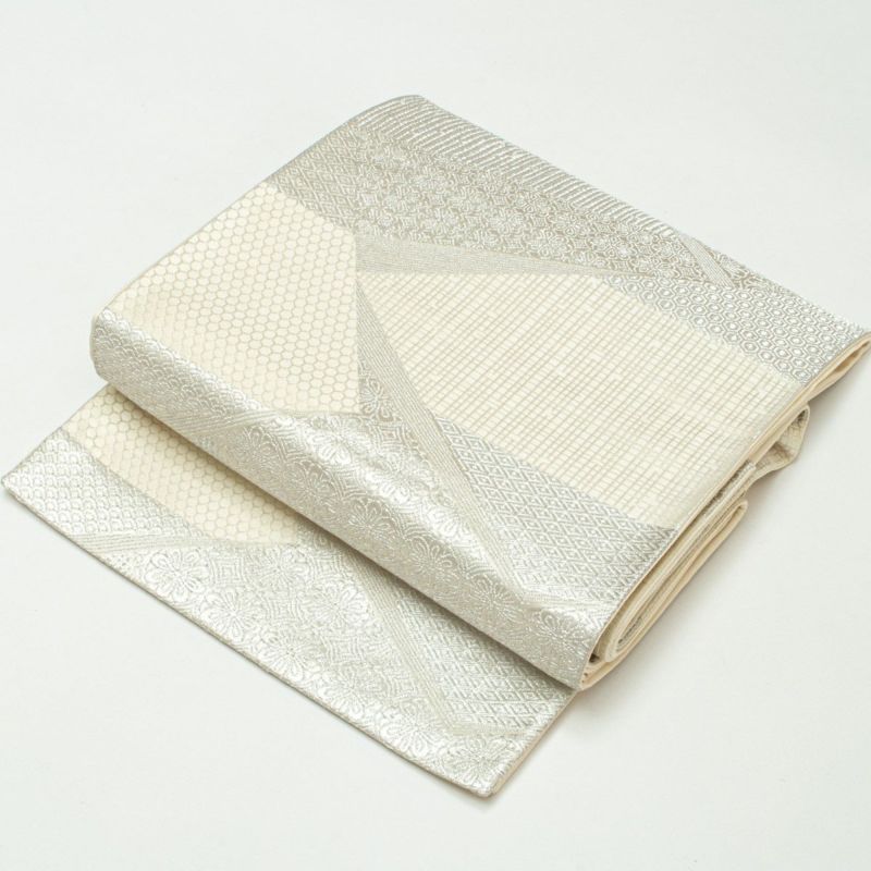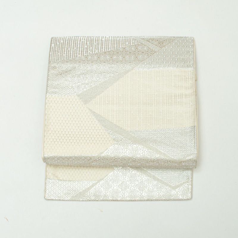 袋帯 割付文様 切り嵌め取り オフホワイト シルバー 銀糸織 正絹 礼装用です。