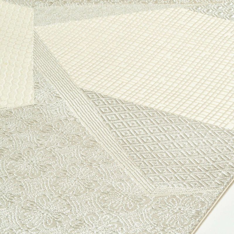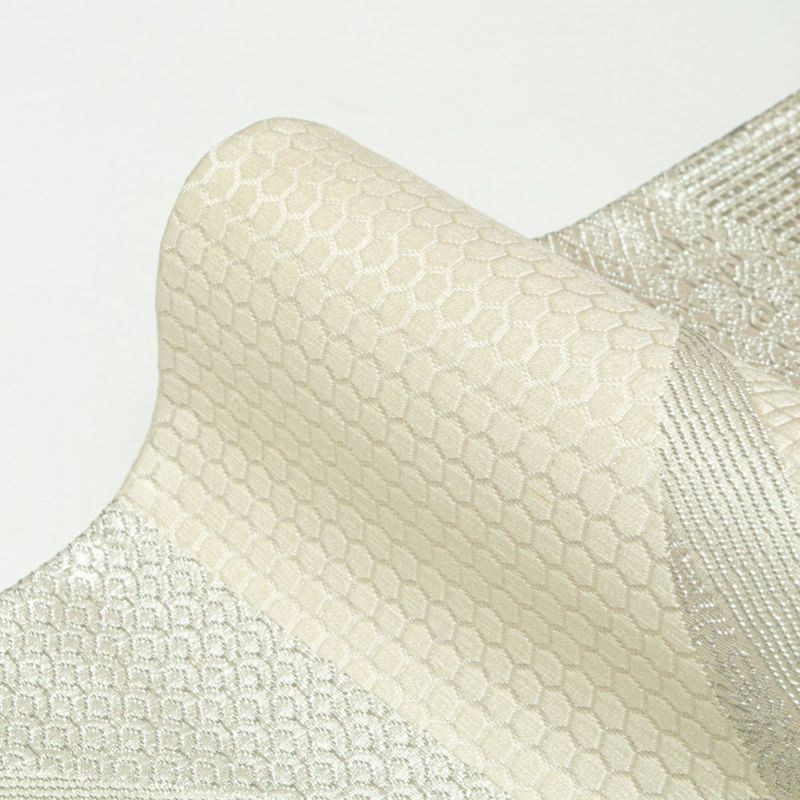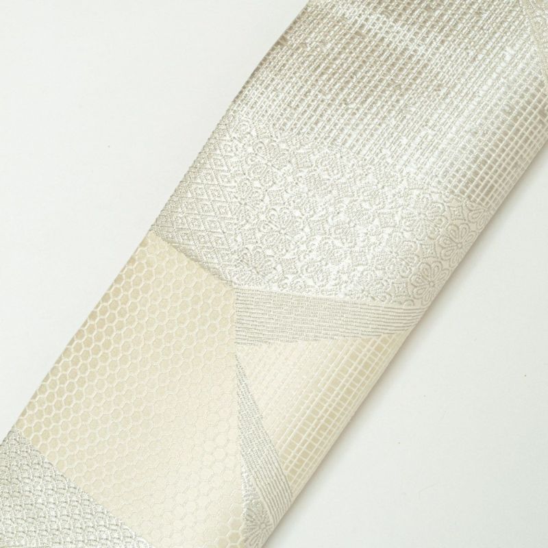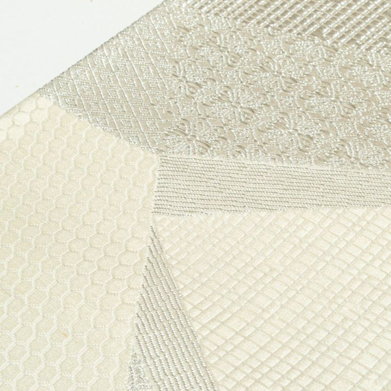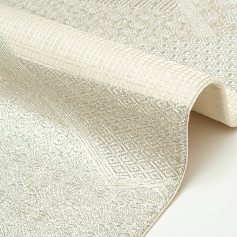 オフホワイトを基調に、銀糸をふんだんに用いた織りが光を柔らかく反射し、上品な華やかさを演出します。