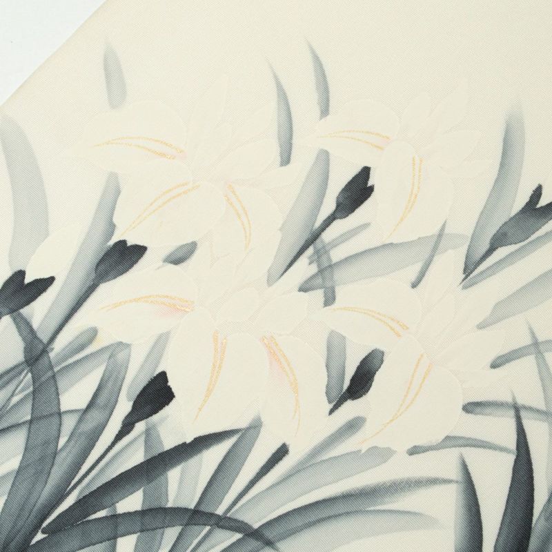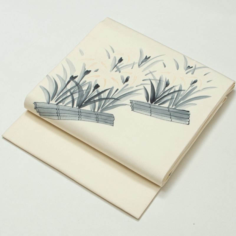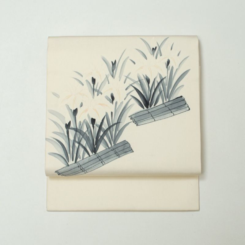 やわらかな塩瀬地に、手描き友禅で花菖蒲の図をあしらった開き名古屋帯です。