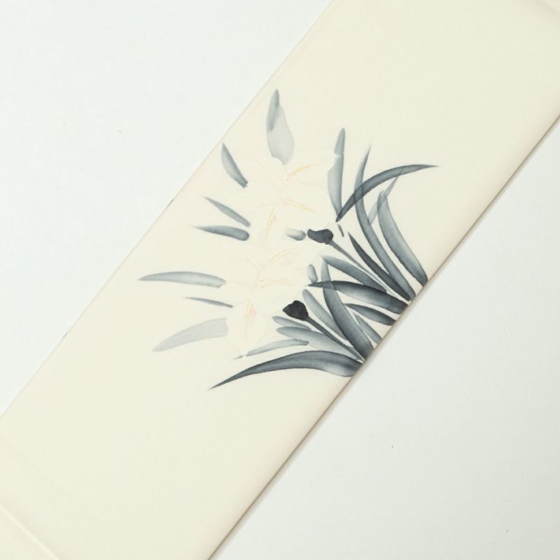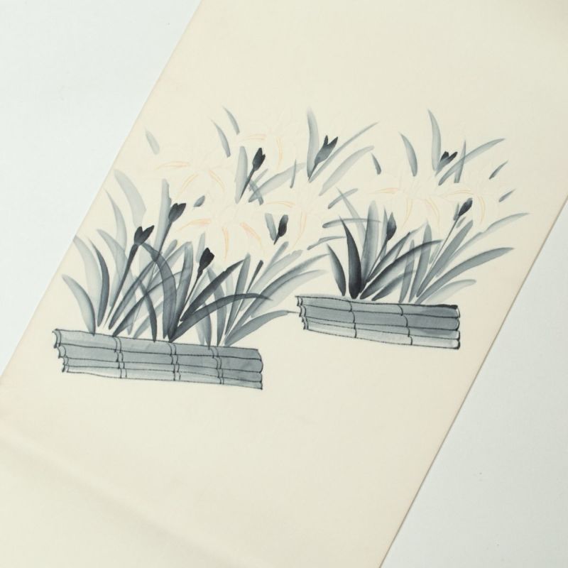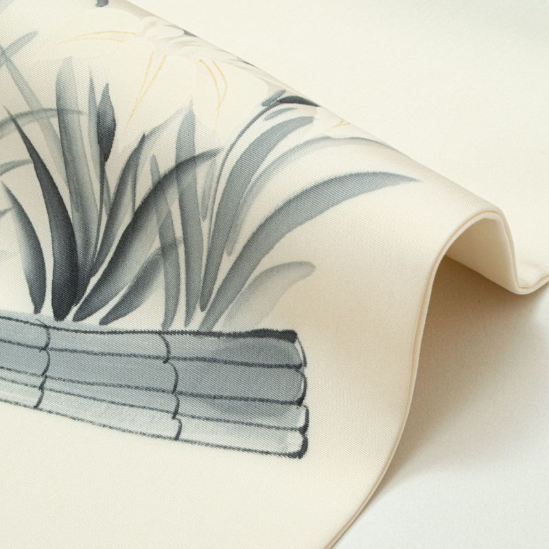 開き名古屋帯 塩瀬 手描き友禅 花菖蒲 水辺文様 オフホワイト 正絹 九寸です。