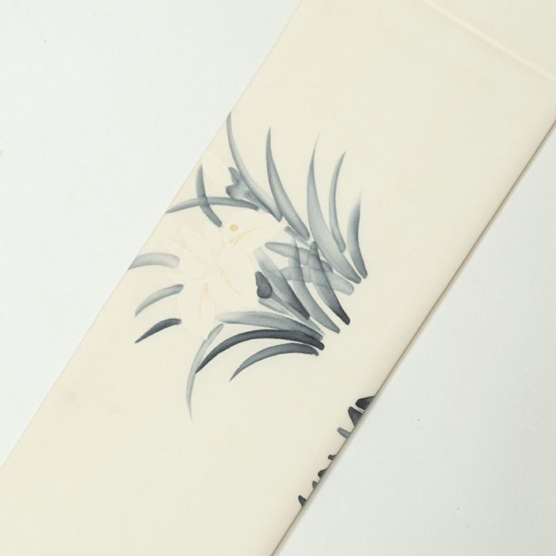 水辺に咲く花菖蒲が、落ち着いた墨色の濃淡と繊細な筆致で表現され、楚々とした美しさを漂わせます。
