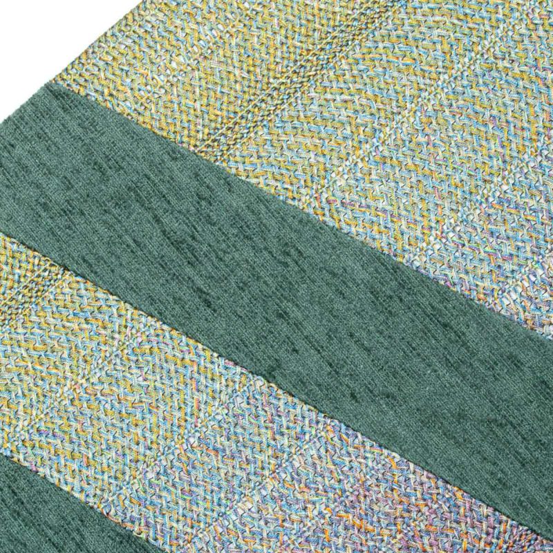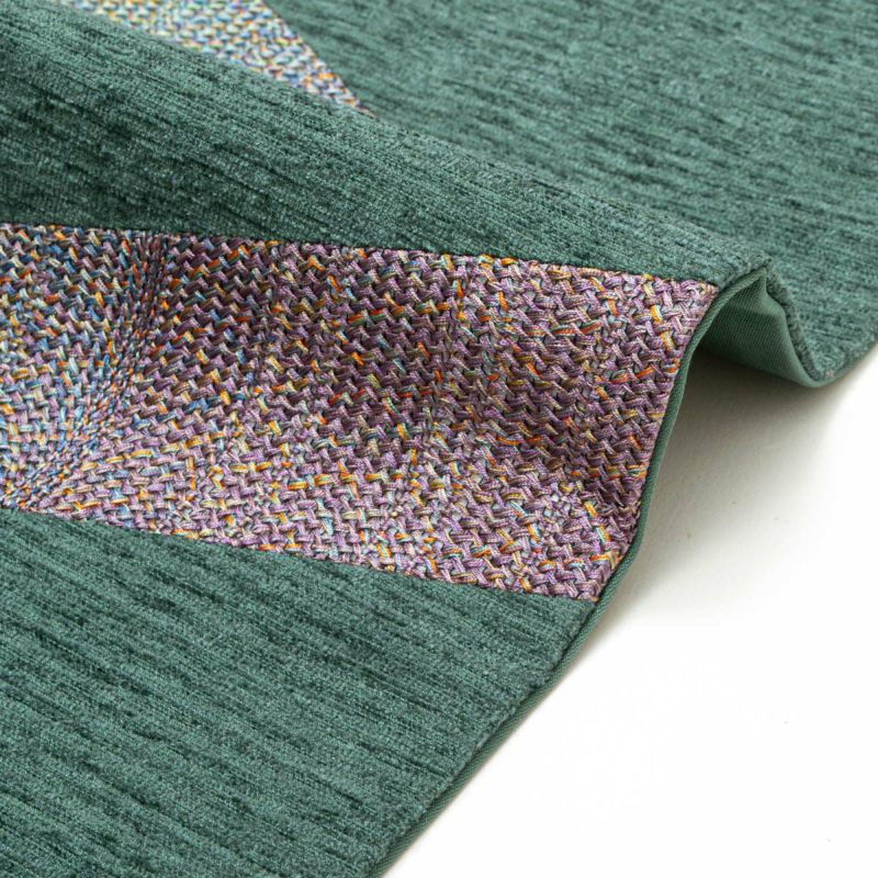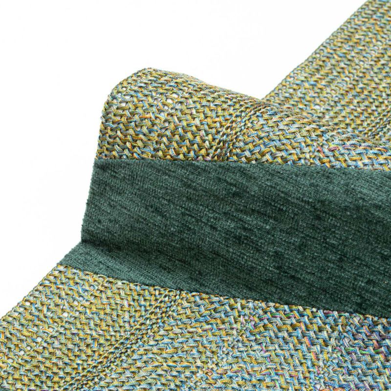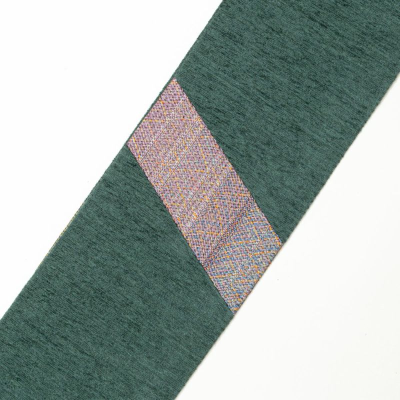 ビロードのような地風をもつベースの鉄色地に、組み織りのパネルが大胆にあしらわれ、幾何学的なパターンがアーティスティックな雰囲気を醸します。