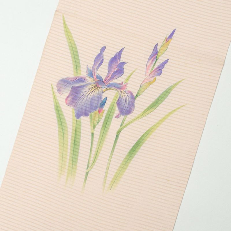 繊細な絽の生地に、手描きで写実的に描かれた花菖蒲が映える盛夏用の名古屋帯です。
