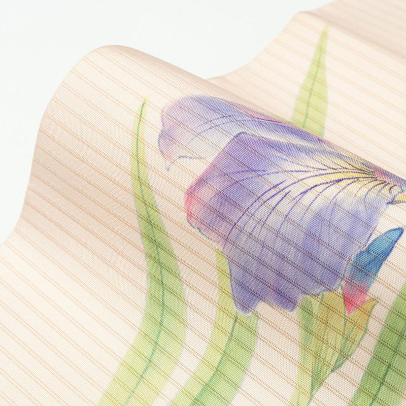 淡くやわらかな薄桜色を地に、すっと伸びる葉と凛とした菖蒲の花が、上品な季節感を醸します。