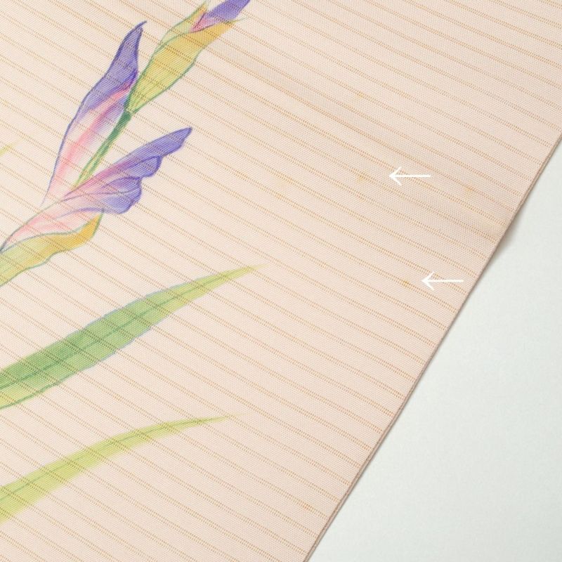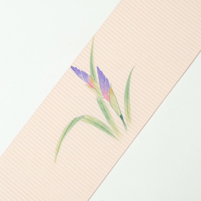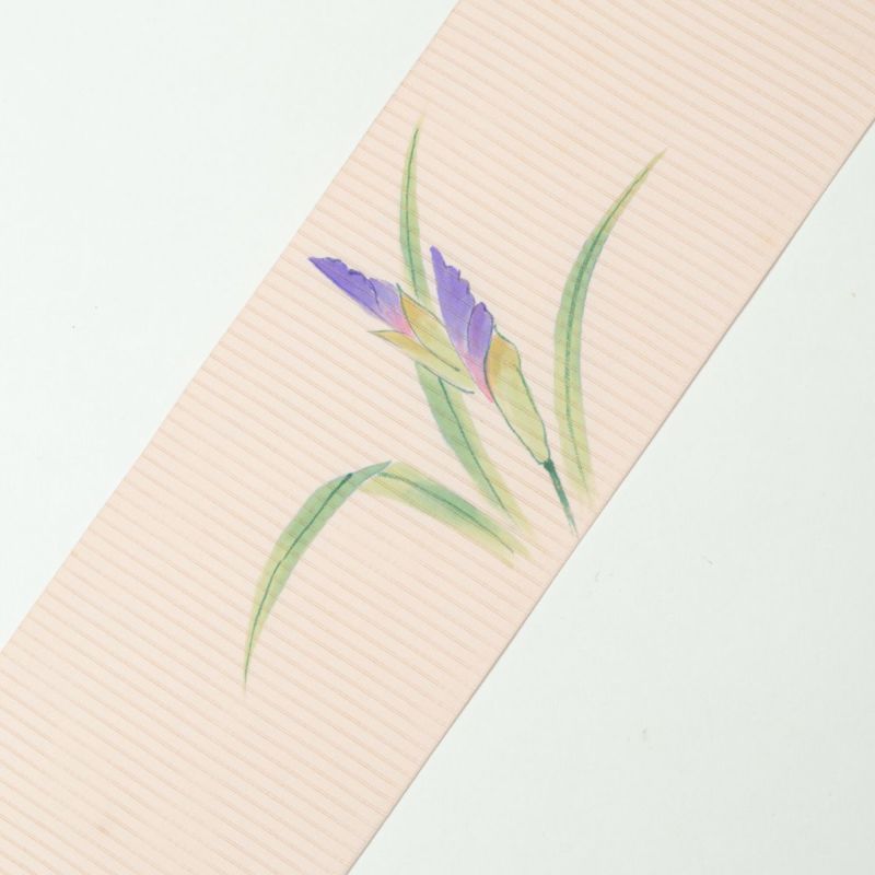 名古屋帯 絽 手描き友禅 花菖蒲 薄桜色 盛夏用 正絹 九寸です。