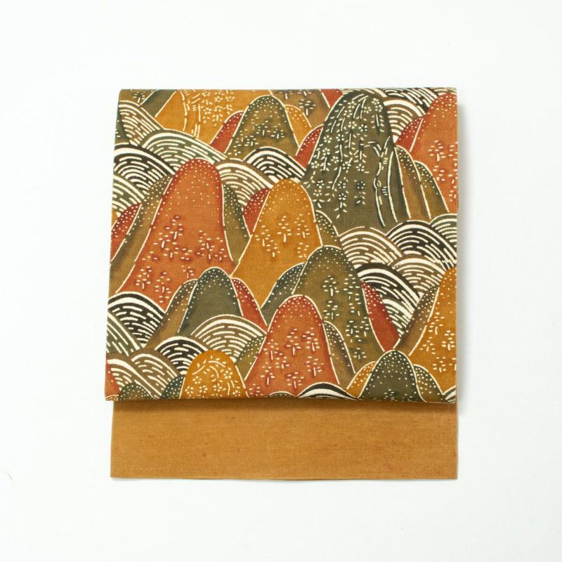 【美品】名古屋帯 紅型風 型絵染め 遠山桜 青海波 ブラウン系 正絹 九寸です。