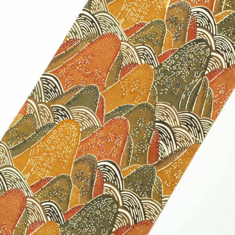大胆な遠山文様に、桜や青海波が重なり合う、紅型風の型絵染め名古屋帯です。