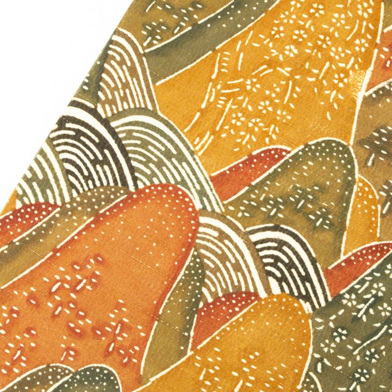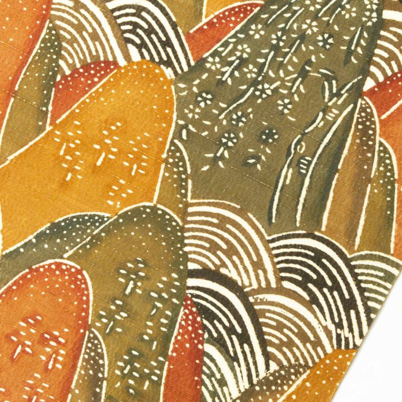 型染ならではの表情豊かな線と彩色が、遠山に重なる花や波の意匠にリズムを与え、見る人の目を引きつけます。