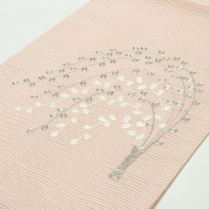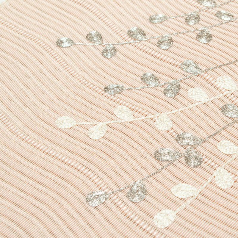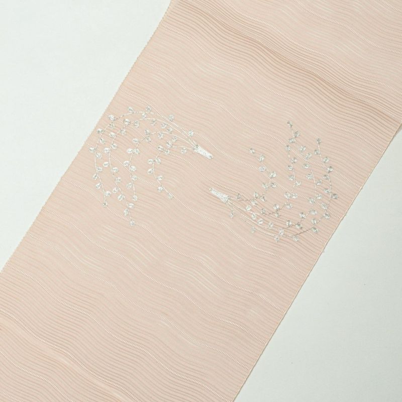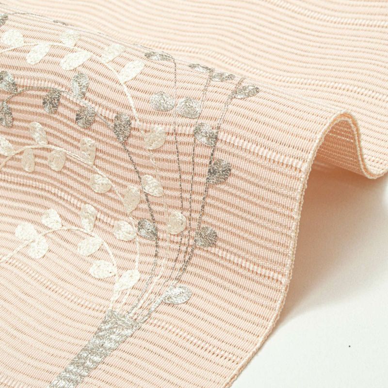 名古屋帯 絽綴れ 波筬織 刺繍 植物文様 モダン 薄桜 白 銀糸 盛夏用 正絹 八寸 です。