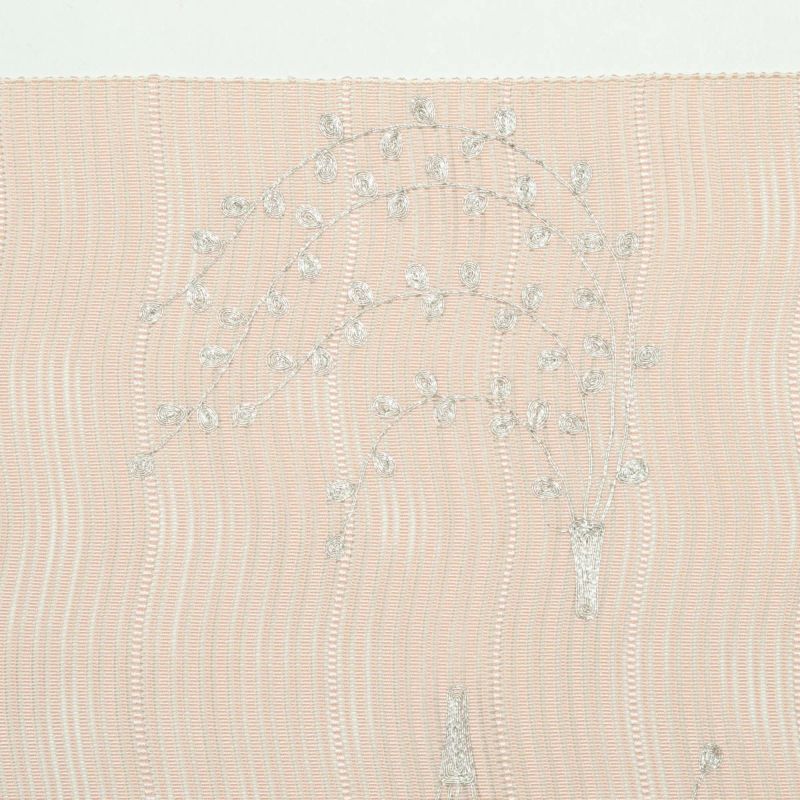 やわらかな薄桜色の地に、白と銀糸を用いた刺繍で、優美な植物文様がモダンに表現されています。