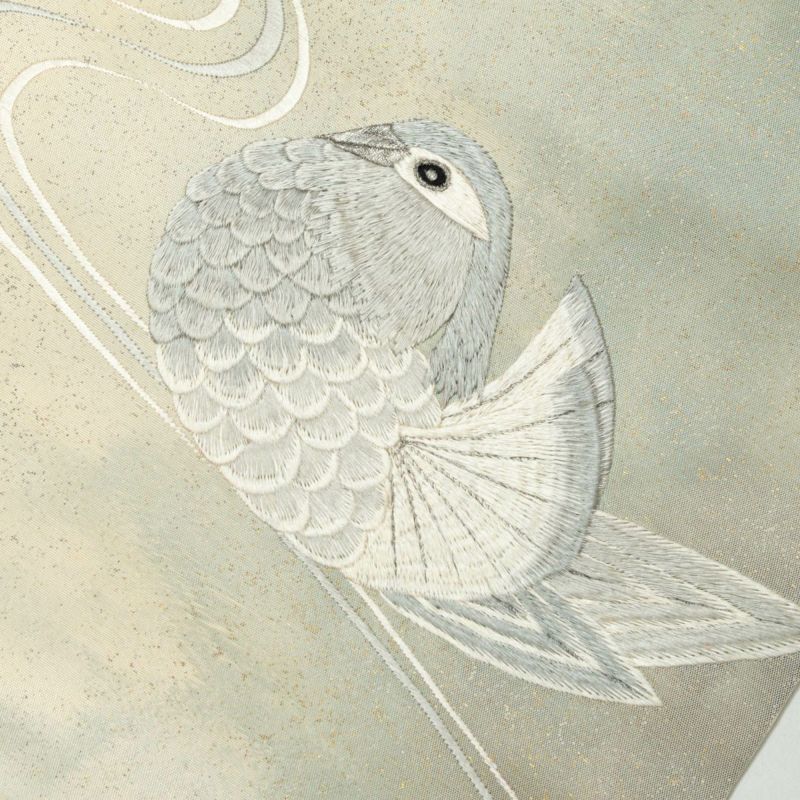 優美な引箔地に、愛らしい鴛鴦(おしどり)を刺繍であしらった名古屋帯です。