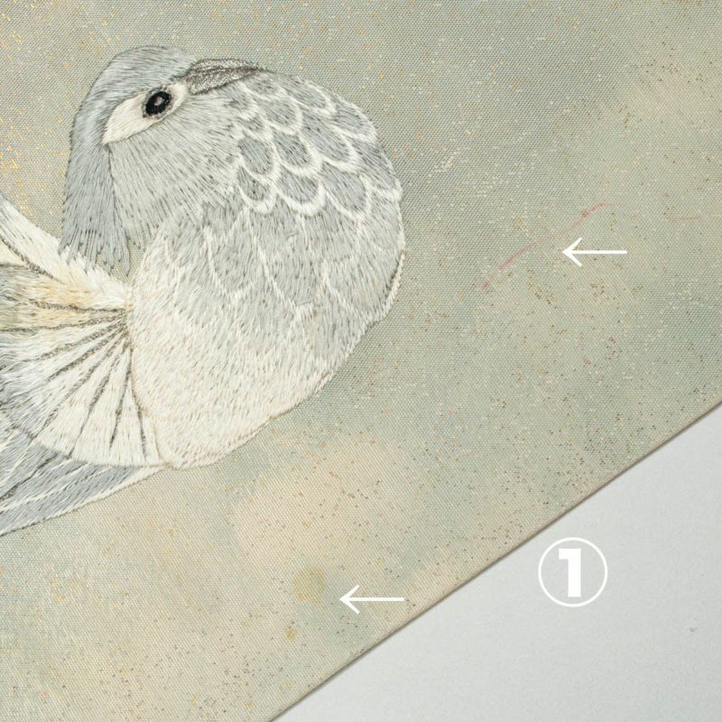 【訳あり品】名古屋帯 引箔 刺繍 鴛鴦の図 オフホワイト 西陣織 正絹 九寸 です。