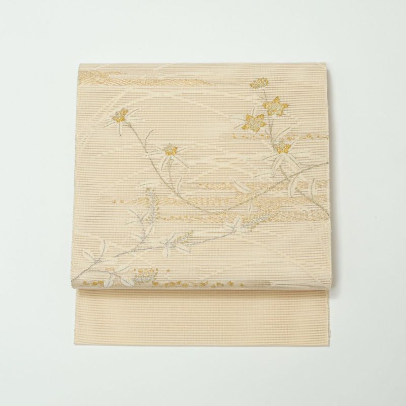 ★SALE40%OFF★開き名古屋帯 絽綴れ 植物文 エ霞文 オフホワイト 金糸入り 盛夏用 正絹 八寸