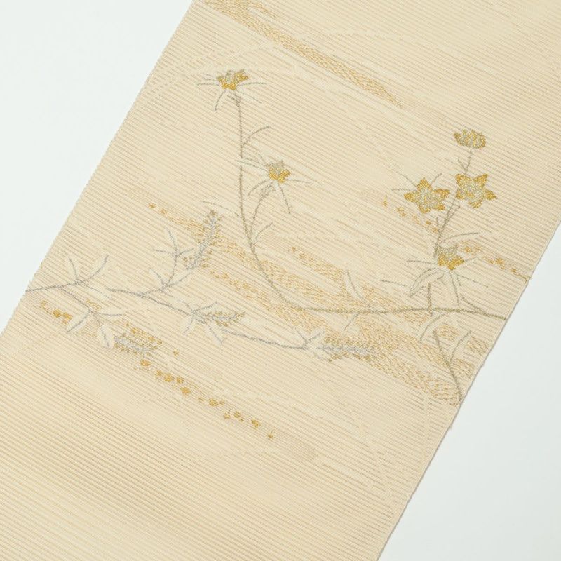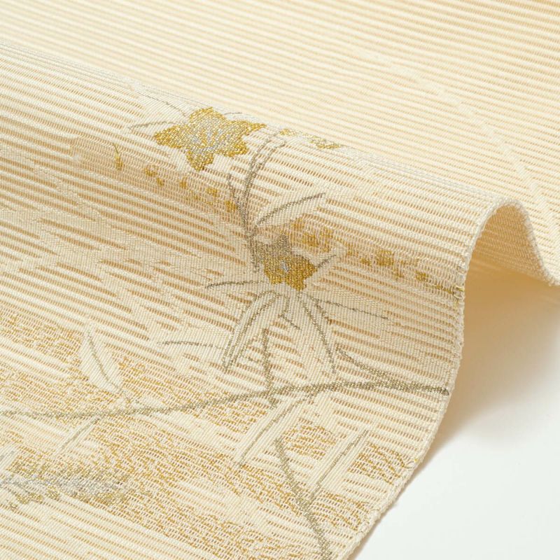 名古屋帯 絽綴れ 植物文 エ霞文 オフホワイト 金糸入り 盛夏用 正絹 八寸です。