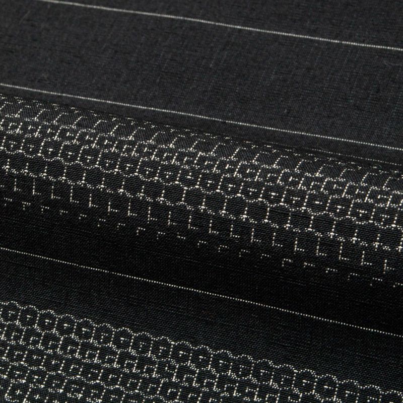 黒地に白の亀甲絣で構成されたボーダーの亀甲柄は、クラシカルでありながらもモダンな趣があり、装いに凛とした印象を添えてくれます。