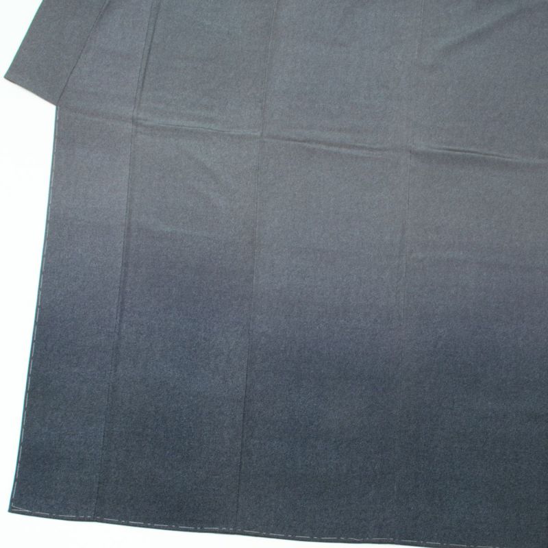 シックなチャコールグレーから濃紺への美しい裾暈しが印象的な、付下げ仕立ての江戸小紋です。
