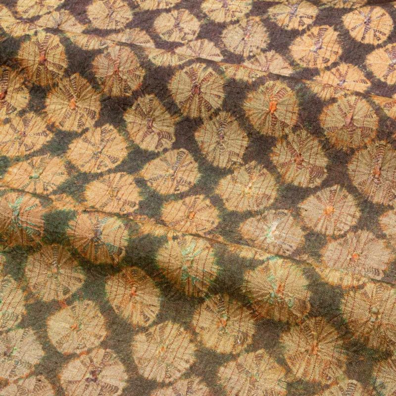草木染めによる自然な色の重なりが、ブラウン系を基調にオレンジや緑、紫などの柔らかなグラデーションを生み出し、奥行きのある印象を与えます。
