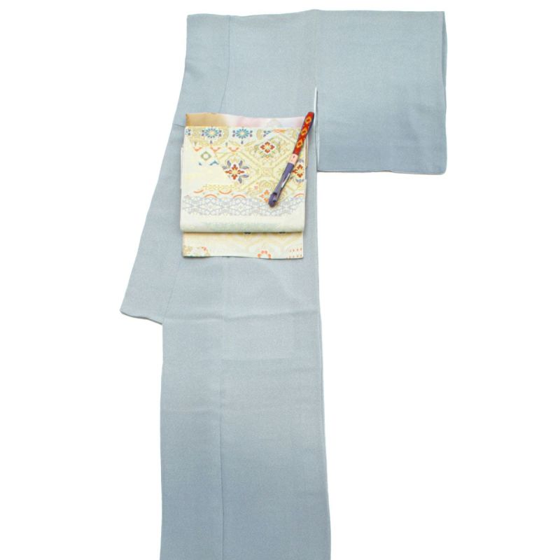 柄は省かれ、無地に近い仕上がりながら、裾から徐々に色が明るくなる染めの表現が絶妙で、控えめながらも洗練された印象を与えます。