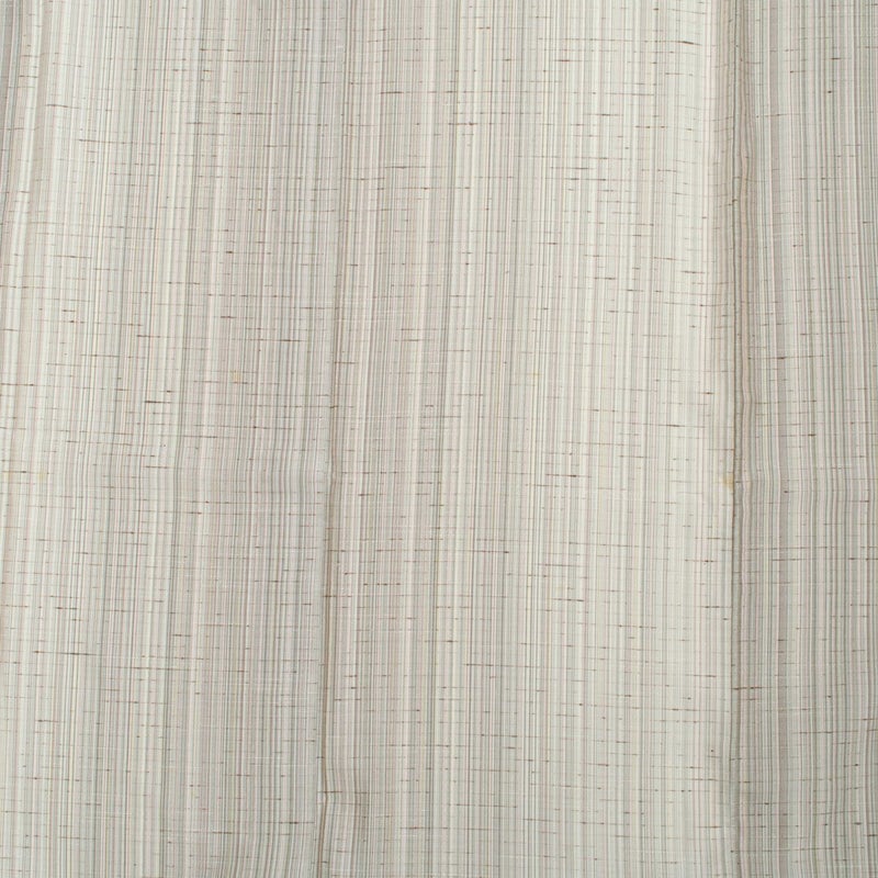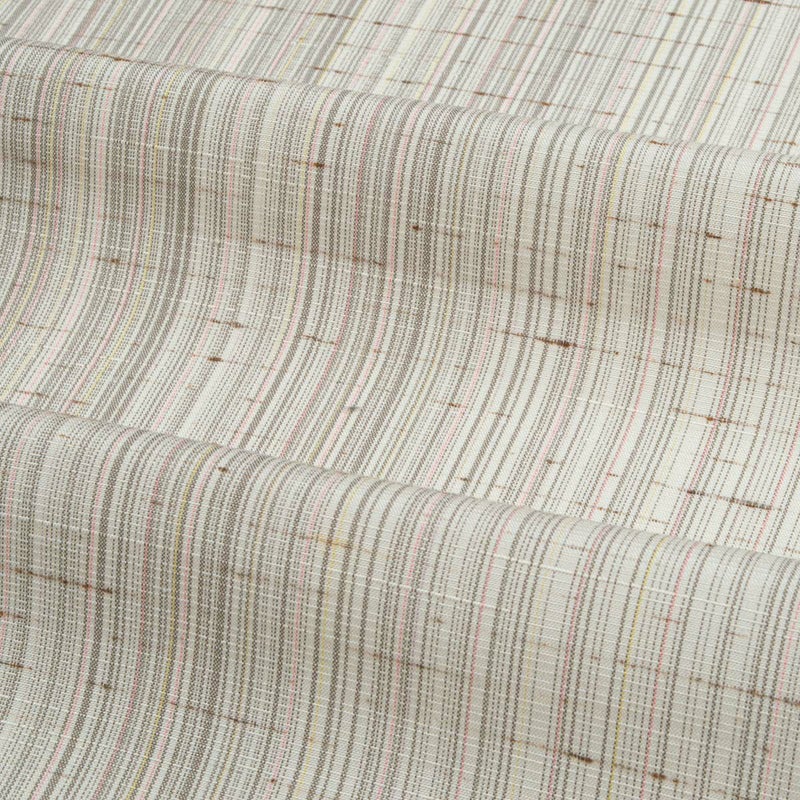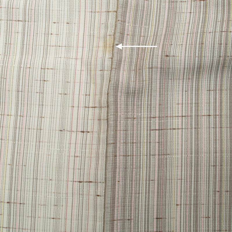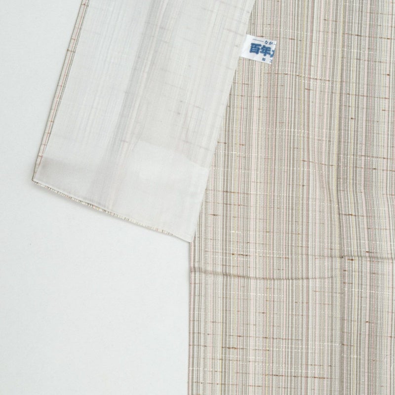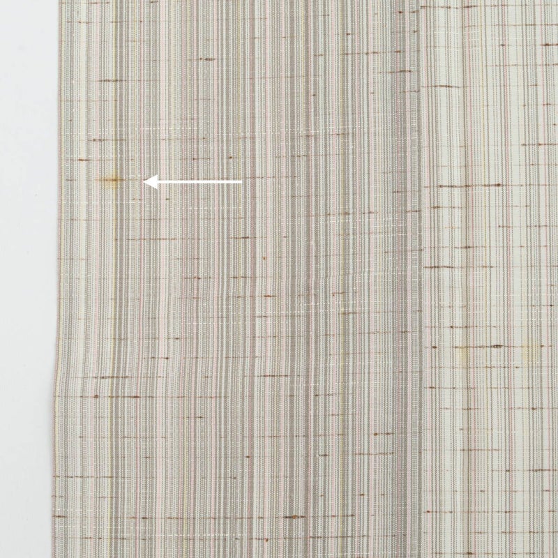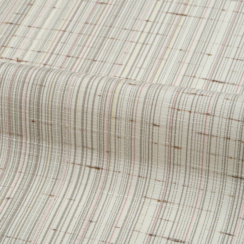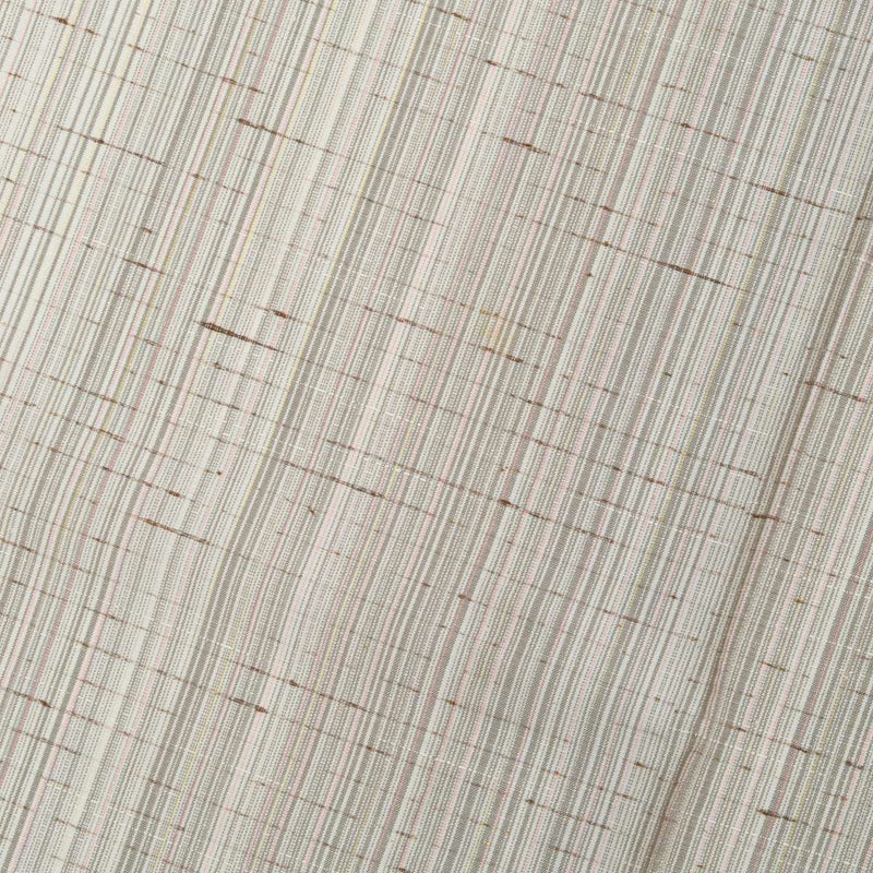 オフホワイトを基調に、ほのかなピンクや鳩羽色が繊細に溶け合う縦のぼかし。ぜんまい糸の節が自然な表情を生み、素朴さの中に上品なニュアンスを感じさせます。