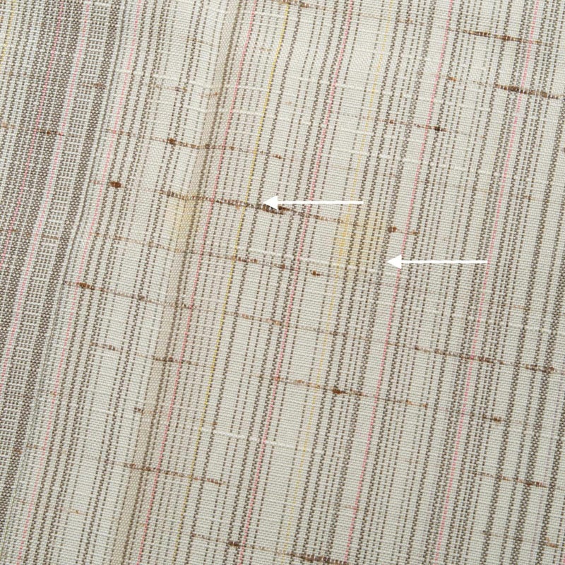 ・上前2か所、右袖後ろの振り、後ろ見頃、背中心裾から40cm上付近に薄い黄ばみ・シミが見られます(画像参照)。いずれも目立つものではございません。