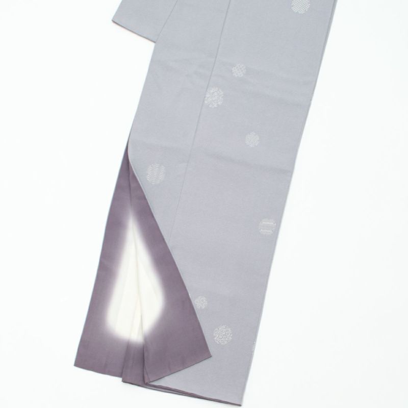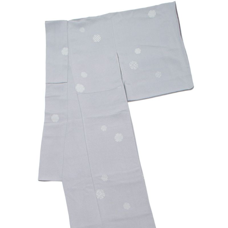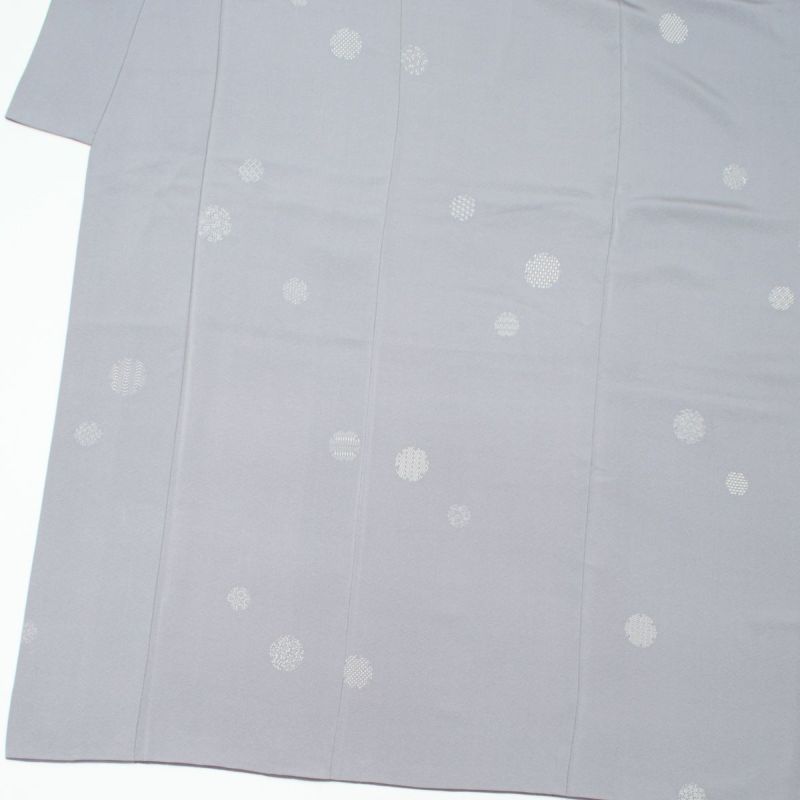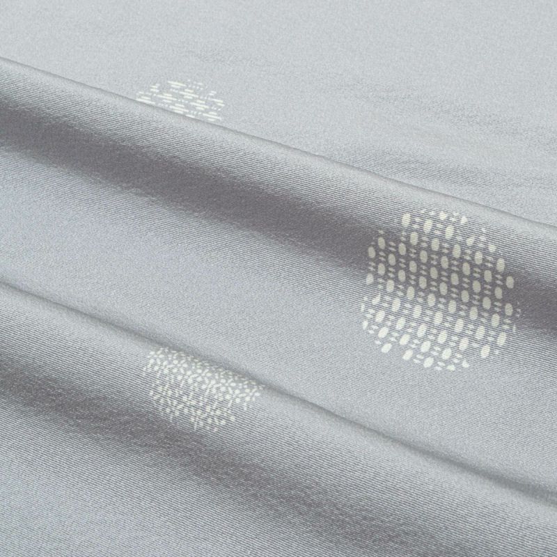 やわらかな藤鼠色の地に、飛び柄で散りばめられた雪輪文様が上品な趣を添える小紋です。