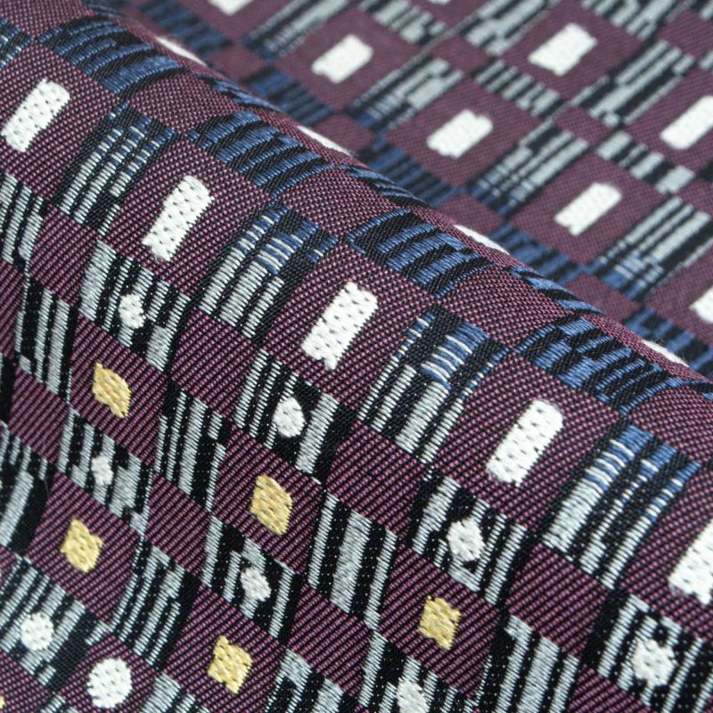 グレーと青紫の横段地に、様々な色を織り交ぜた幾何学模様が全体にリズムよく配されたスタイリッシュな雰囲気の一本。