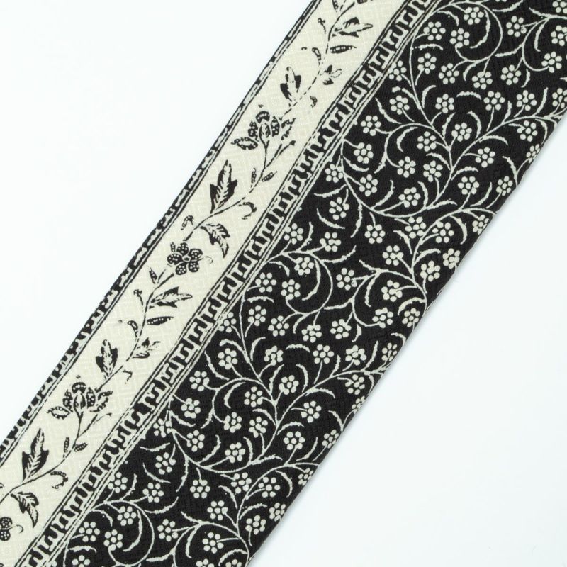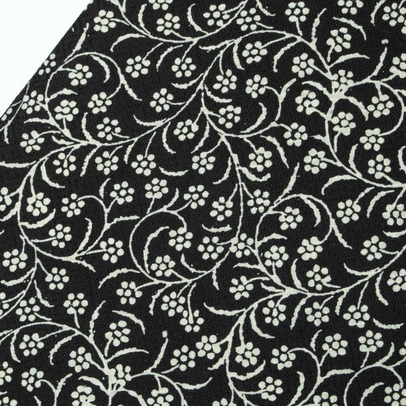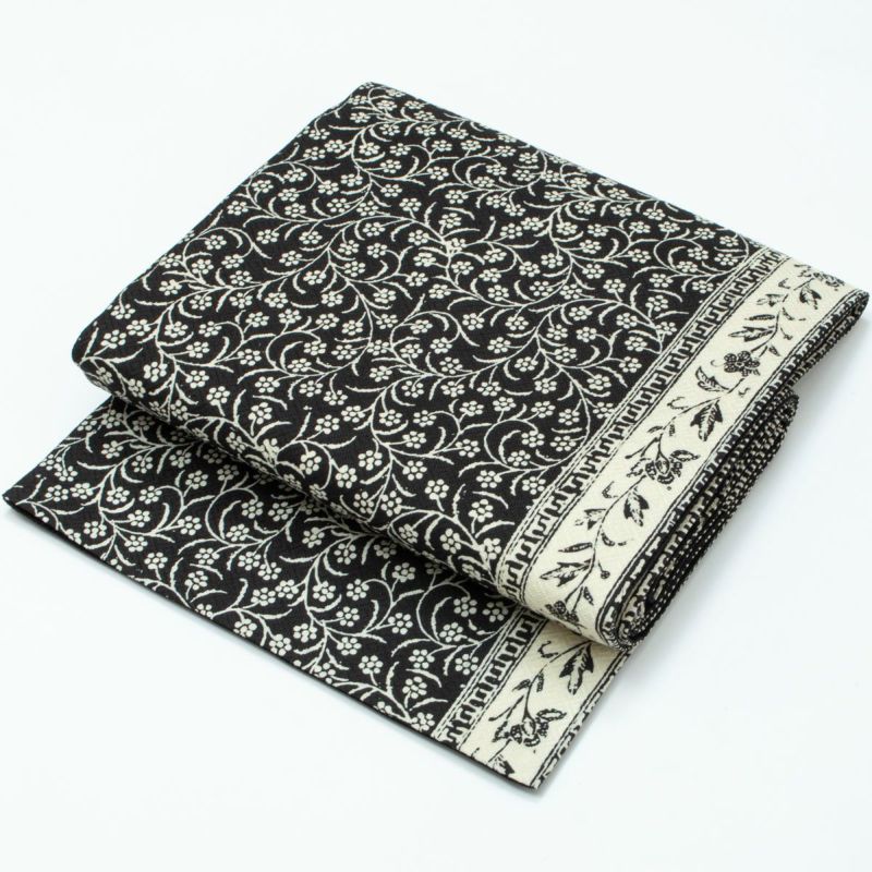 黒とオフホワイトのモノトーンでまとめられた花唐草や更紗文様が、連なりながらも程よいリズム感を生み出し、全体に洗練されたモダンさが宿っています。