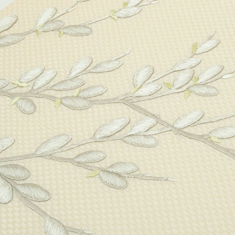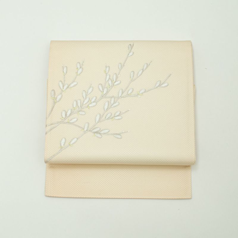 やわらかな光をまとったような、優しいオフホワイト地に、猫柳の枝を繊細な刺繍であしらった開き名古屋帯です。