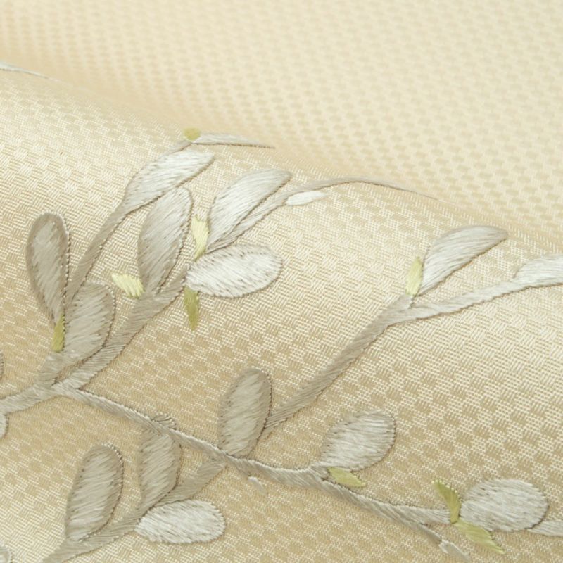 ふっくらとした銀糸と淡い若芽色の刺繍糸が、猫柳の柔らかな芽吹きを表現し、上品で奥ゆかしい趣を醸し出しています。