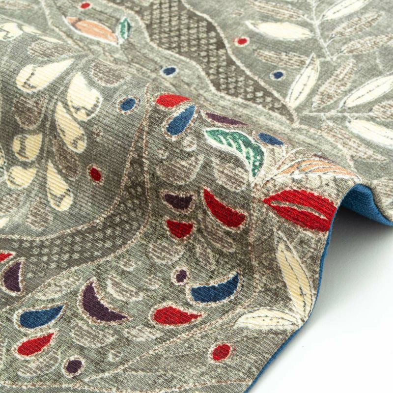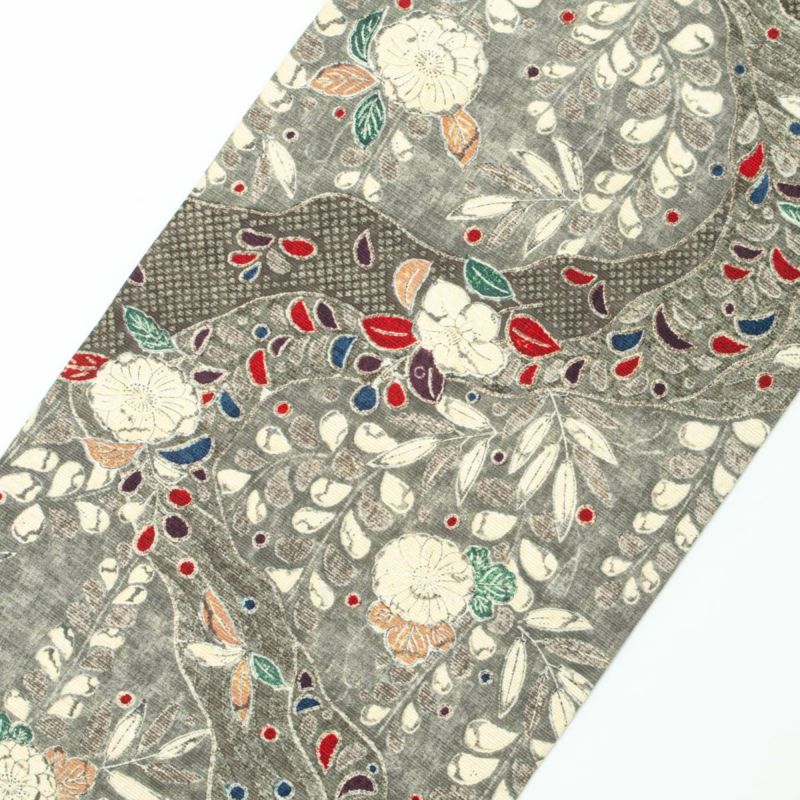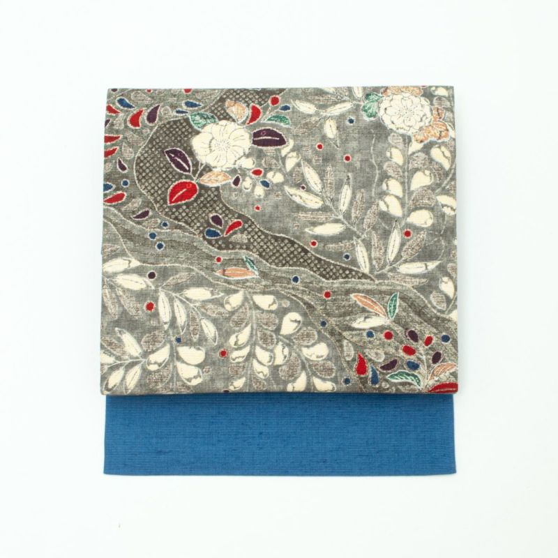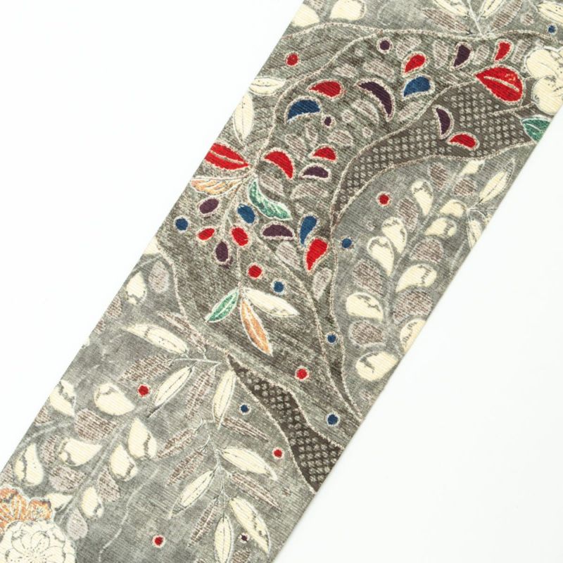 やや赤みを帯びたグレーの地に、白・赤・緑・紫など多彩な色で草花や葉が配され、優雅で奥行きのある印象に仕上がっています。落ち着いた色調の中に、彩り豊かなアクセントが映える、品のある華やかさが魅力です。
