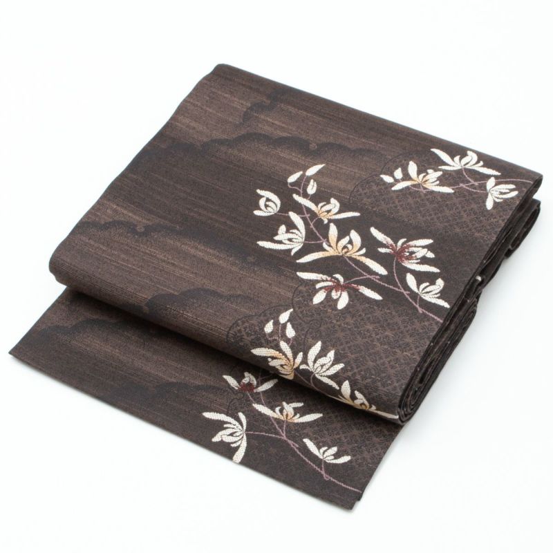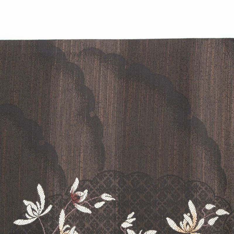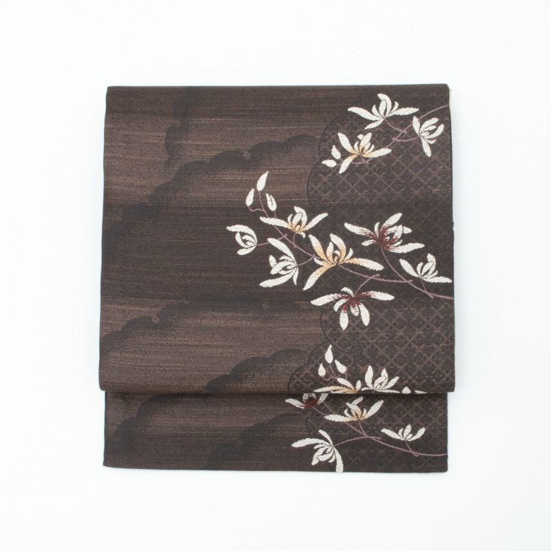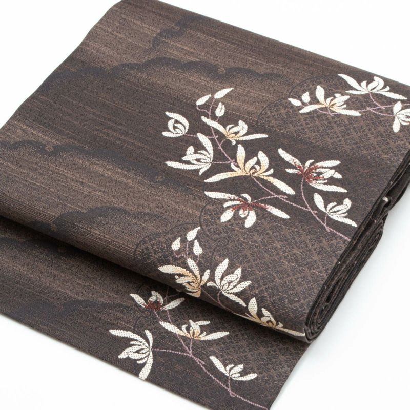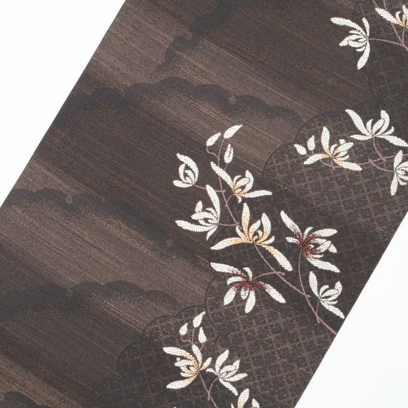 【美品】洒落袋帯 蘭の花の図 雪輪重ね チョコレートブラウン 横段暈し 西陣織 正絹です。