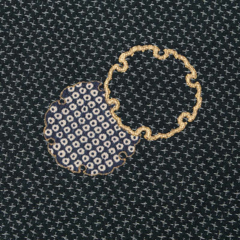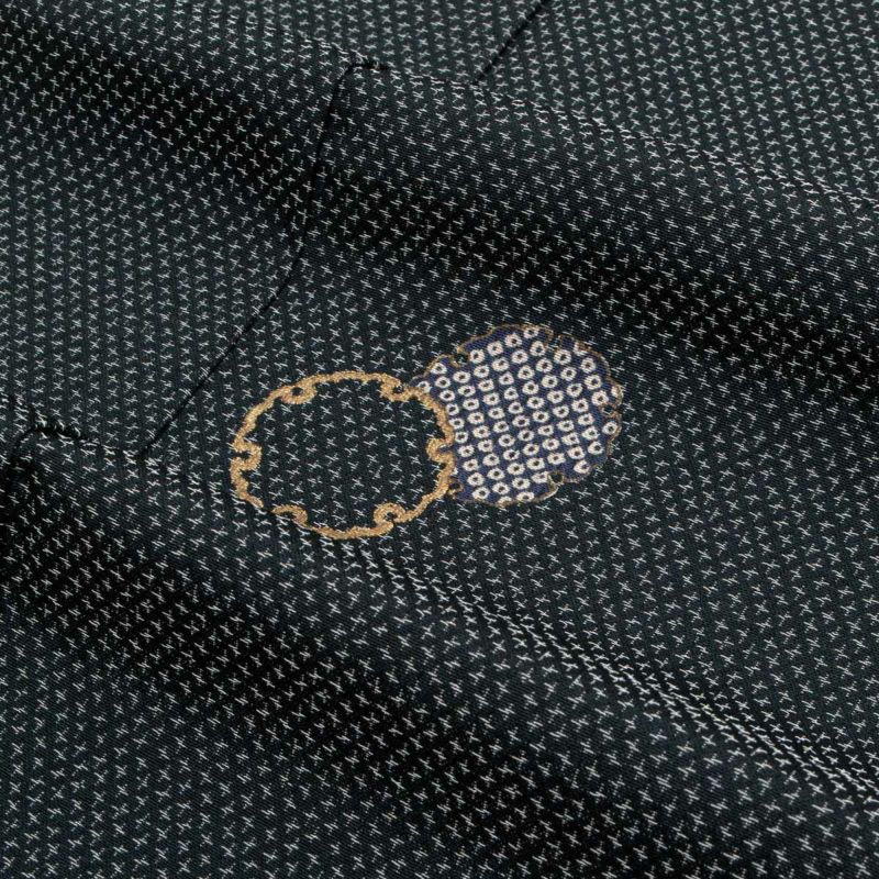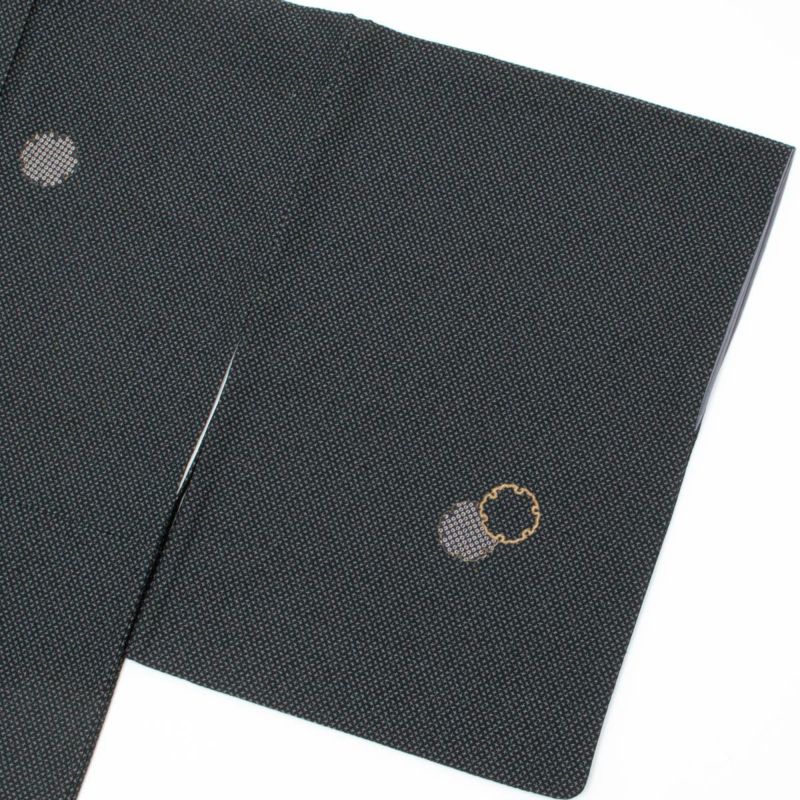 深みのある黒地に、モダンな雪輪文様があしらわれた御召の訪問着です。