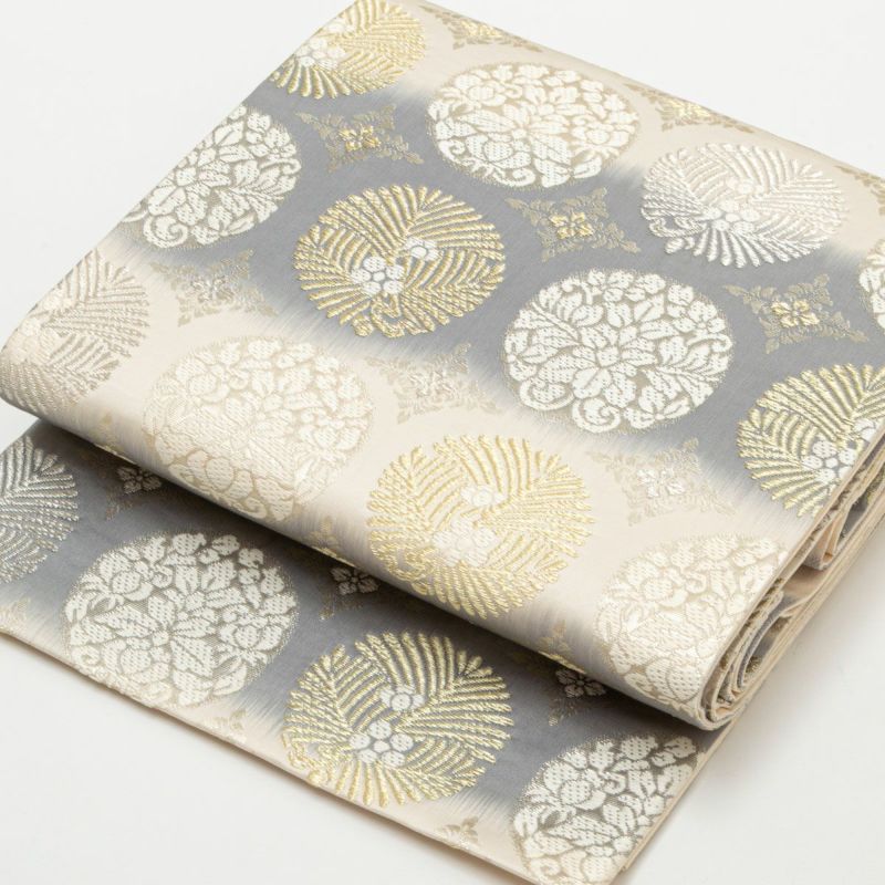 【前田眞織物】袋帯 唐織 草木染 金糸織 唐花丸紋 オフホワイト グレー 暈し横段 西陣織 正絹 礼装用です。