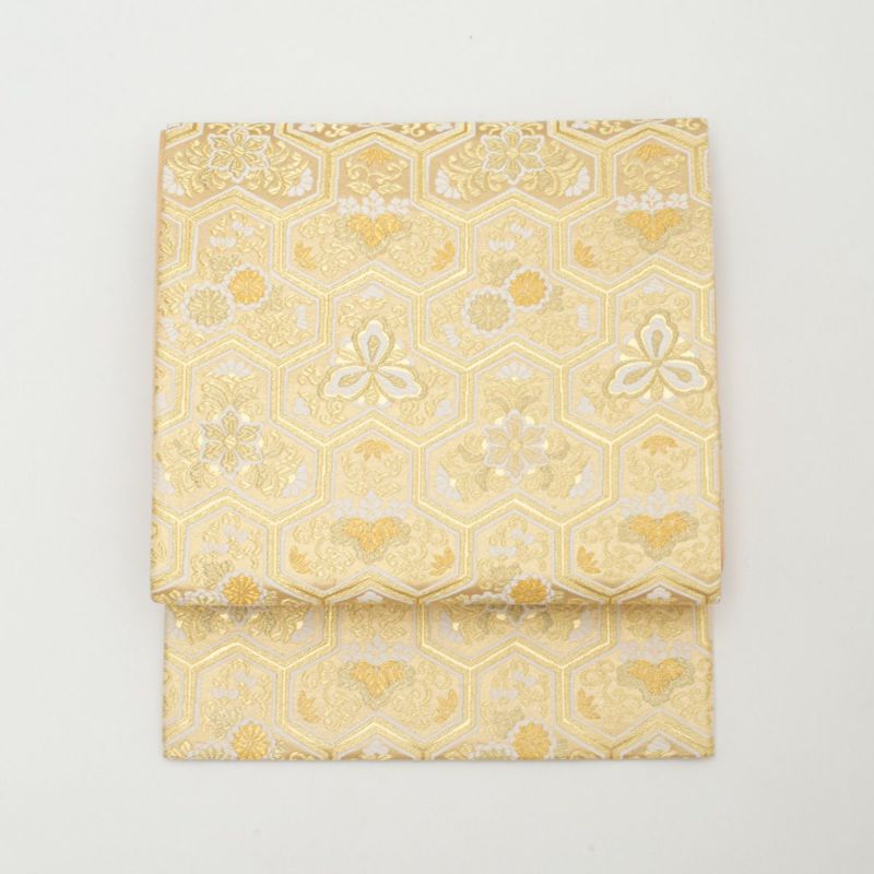 上品な光沢を放つゴールドと白を基調とし、唐花唐草文様が唐織で華やかに織り出されています。
