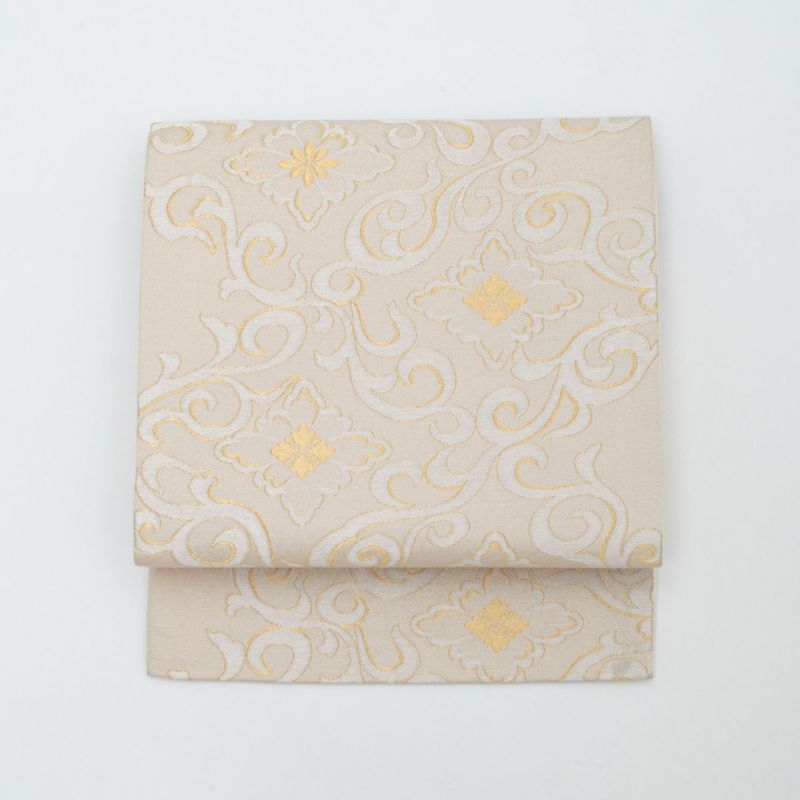 【未使用品】袋帯 唐花唐草文 オフホワイト シャンパン ゴールド 西陣織 正絹 礼装用 です。