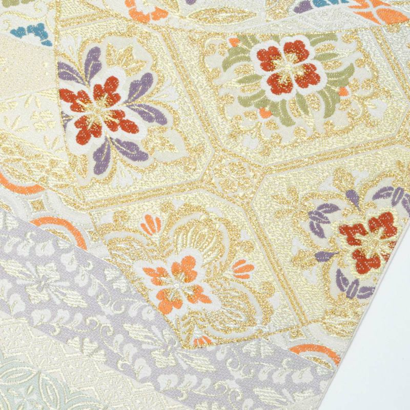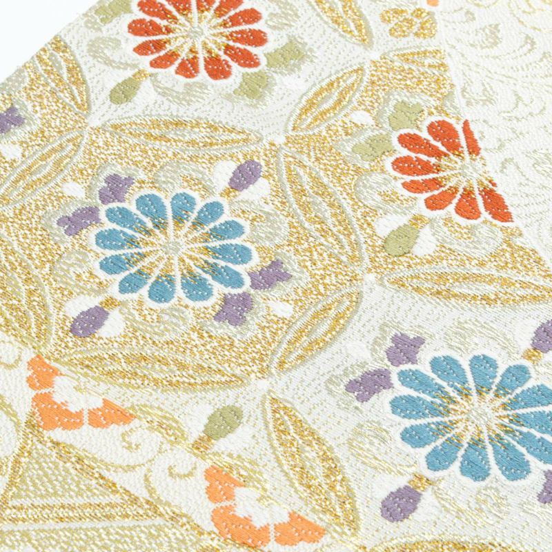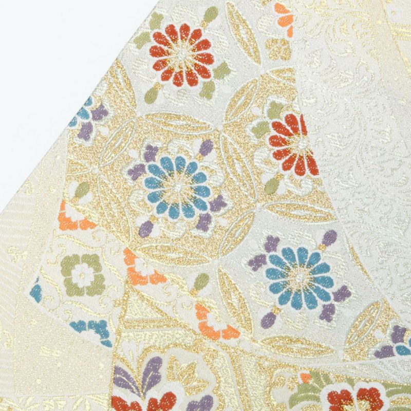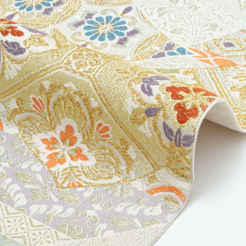 地色は淡い生成色系で、金糸や色糸が映える上品な彩りです。