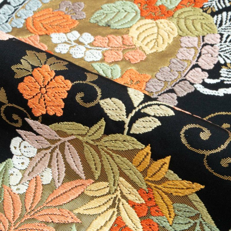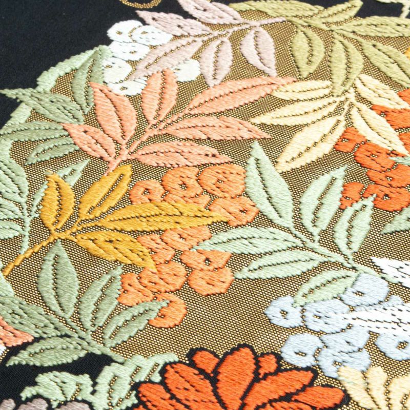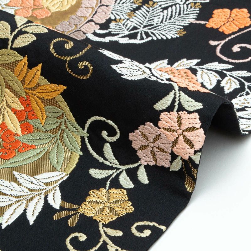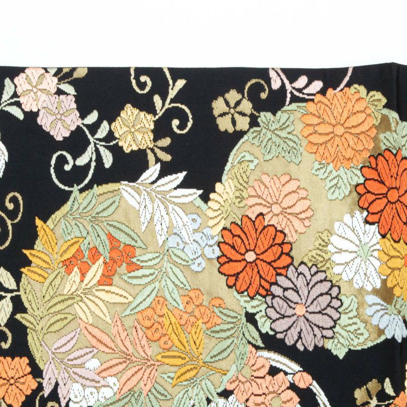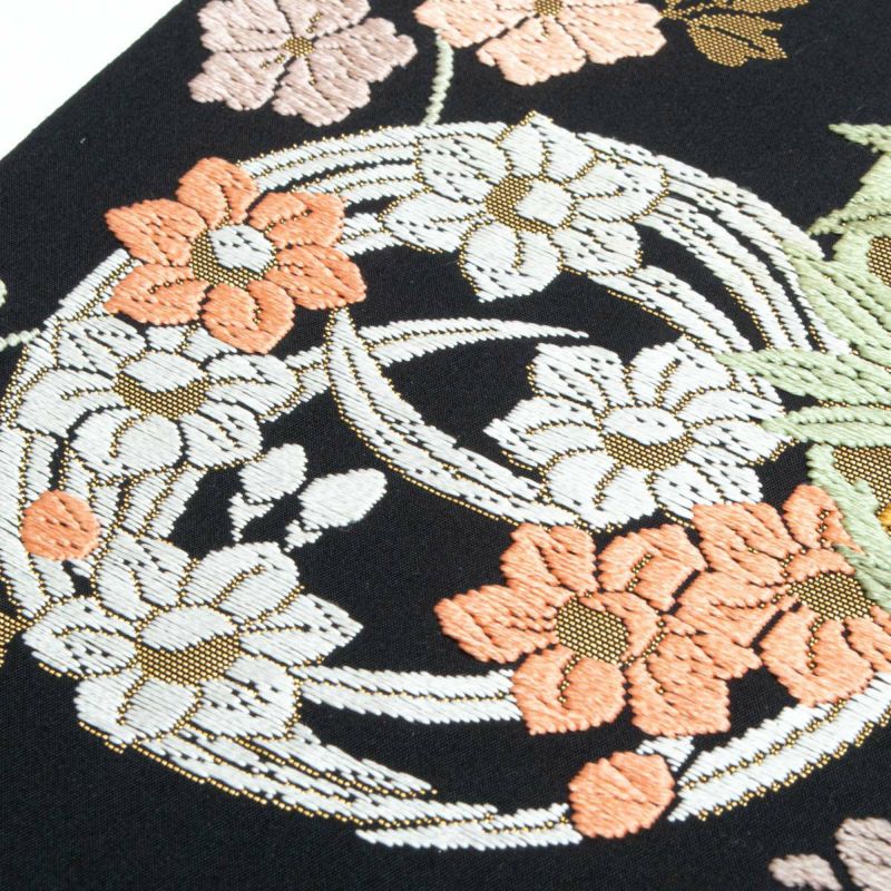 花々は丸文として配置され、華やかさの中にも整った格式が漂います。色とりどりの花弁や葉には淡いパステル調の配色も交えられ、黒地とのコントラストが美しく映えます。