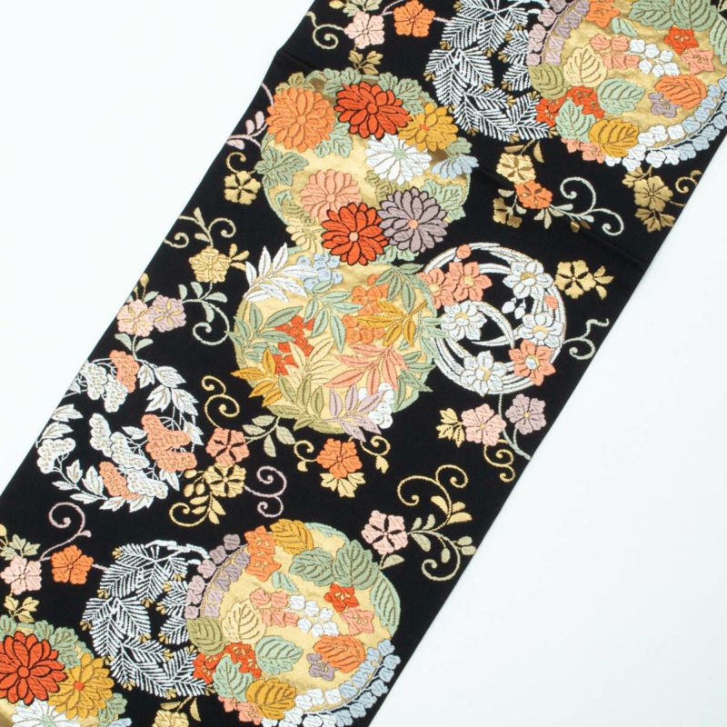 漆黒の地に、唐織で織り出された四季花の丸文が華やかに咲き誇る西陣織の袋帯です。
