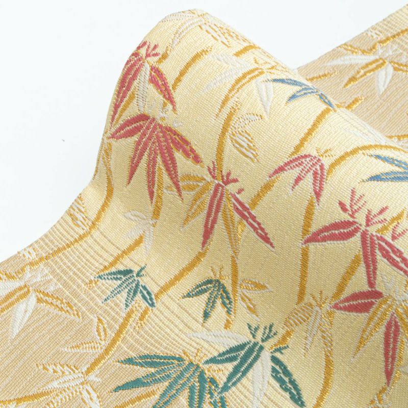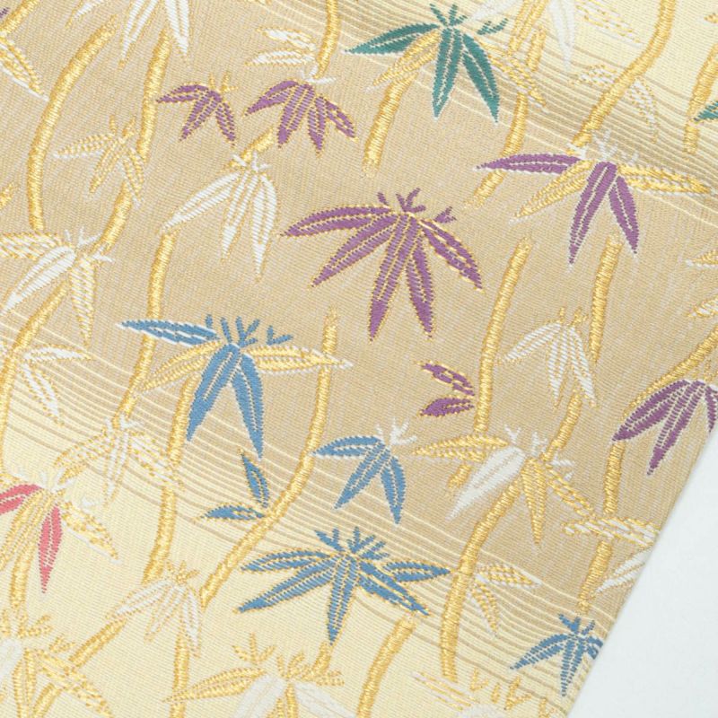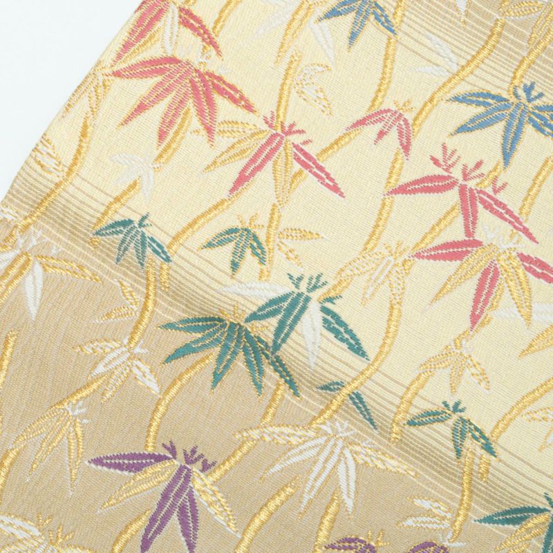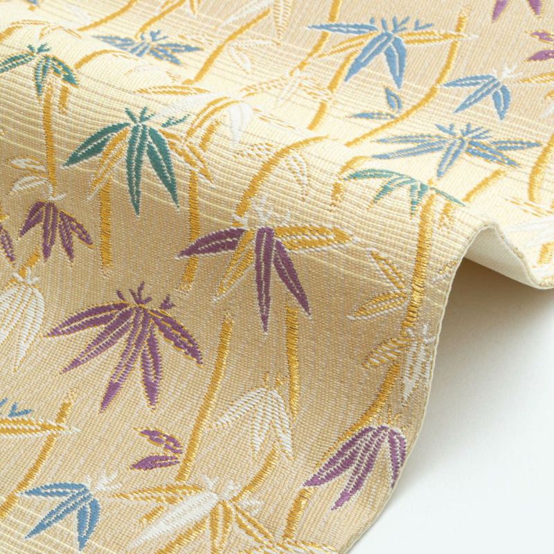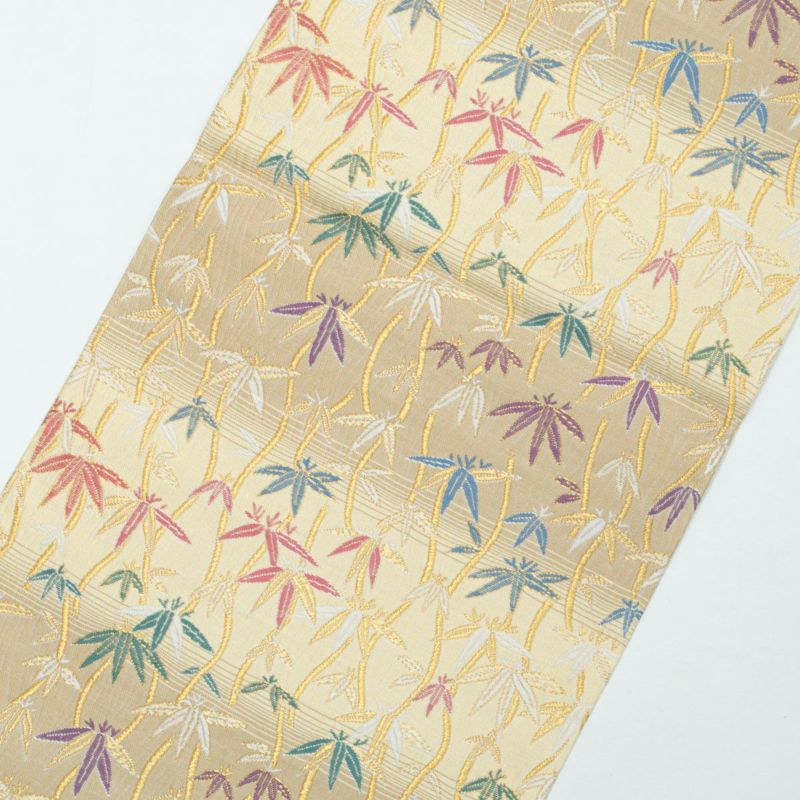 やわらかな ベージュ〜ライトイエローの横段暈し を地に、立涌文と笹の葉があしらわれた袋帯です。