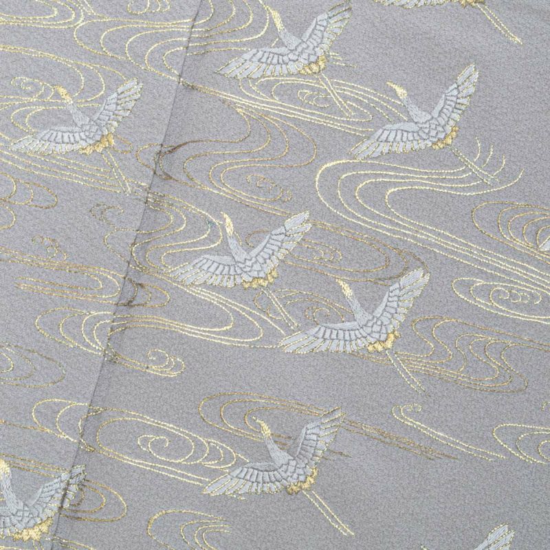 柔らかなグレーの地色は、光の加減でほんのりと艶を帯び、刺繍の金糸・銀糸が上品に浮かび上がります。