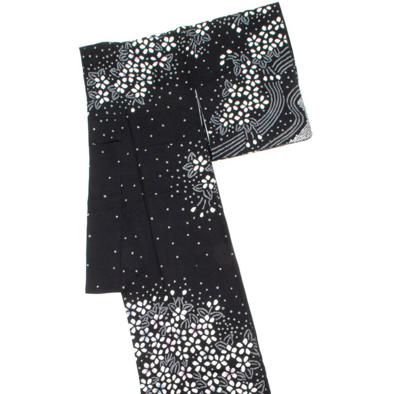 裾には流れるような曲線文様があしらわれ、白抜きの花が優雅に広がるデザインです。