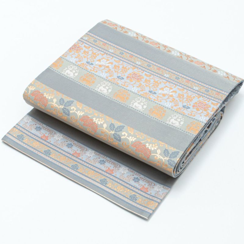 やさしいブルーグレーをベースに、金糸と淡い橙色・水色の彩りが美しいアクセントとなり、幅広い年代の方にお楽しみいただける一本です。