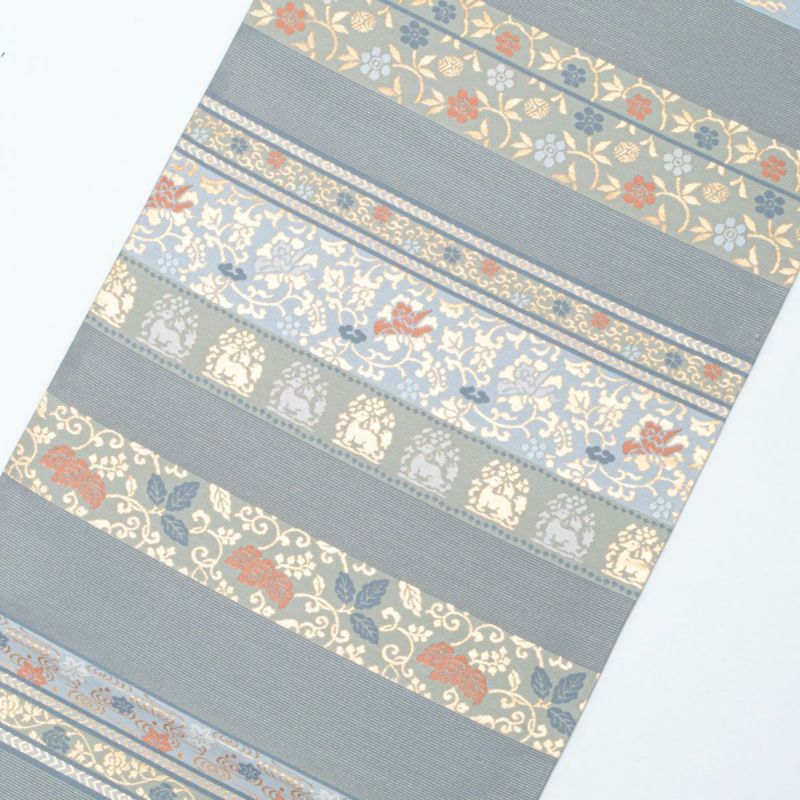 【未使用品】袋帯 横段取り 名物裂 花兎 花唐草 観世水 秘色色 金糸織 西陣織 正絹 礼装用 です。