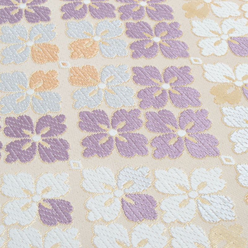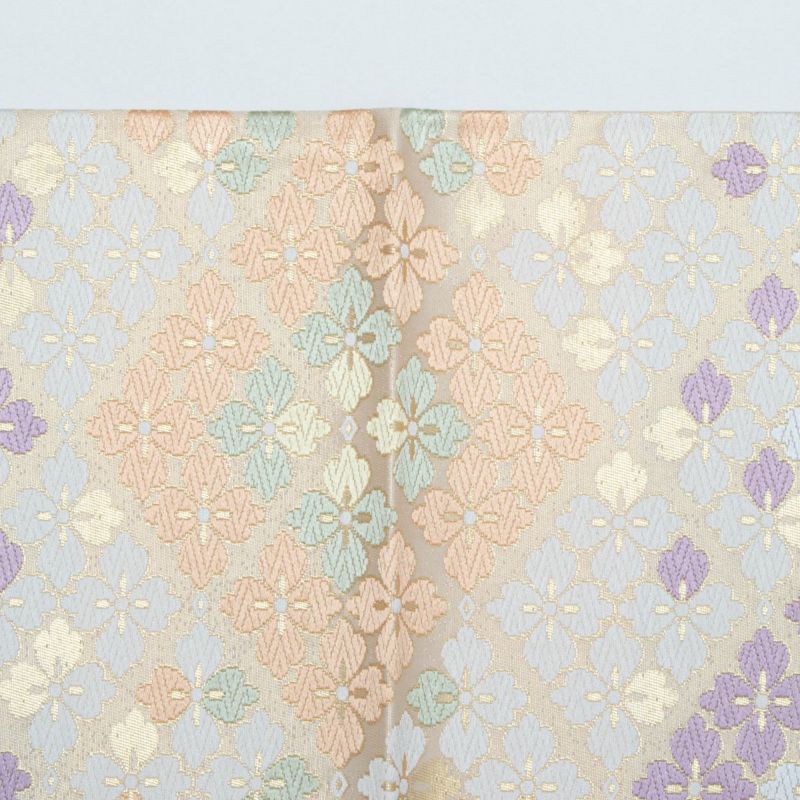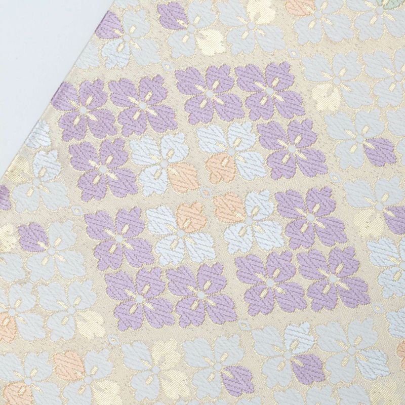唐織ならではのふっくらとした立体感があり、淡い桜・薄紫・若葉色などを散らした、多色ながら落ち着きのある美しい彩りが魅力です。