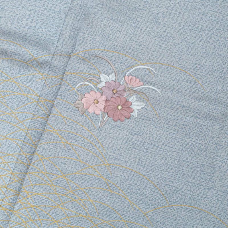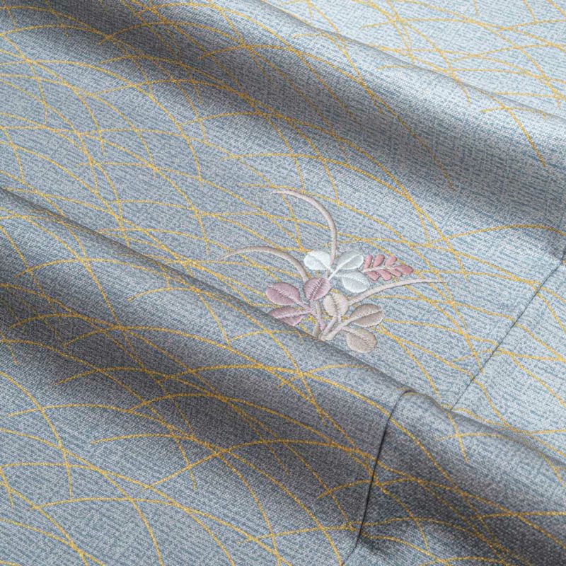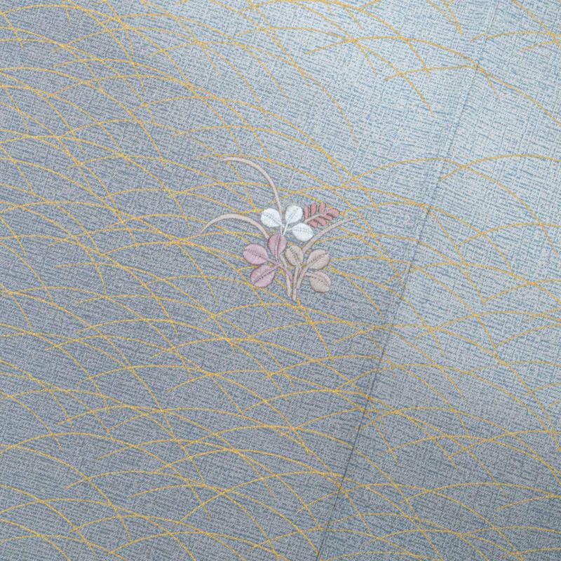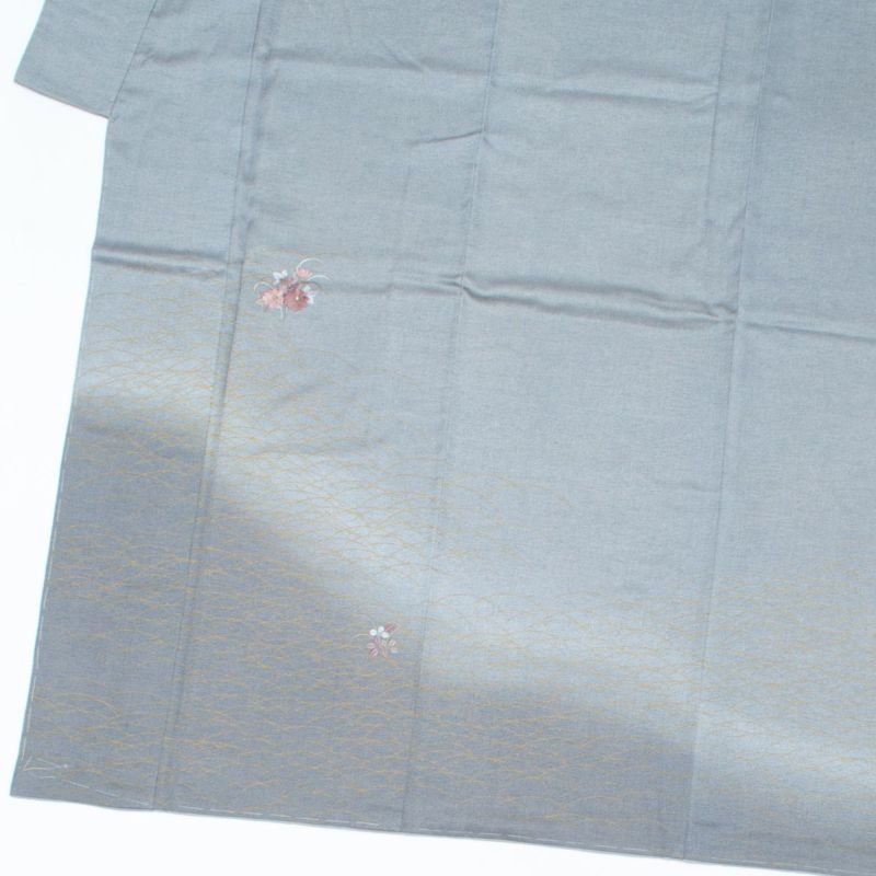 友禅と刺繍を組み合わせた控えめで洗練された意匠は、年齢を問わず長くお召しいただけるデザイン。淡いグレーの濃淡が体のラインをすっきり見せ、帯合わせもしやすい一枚です。