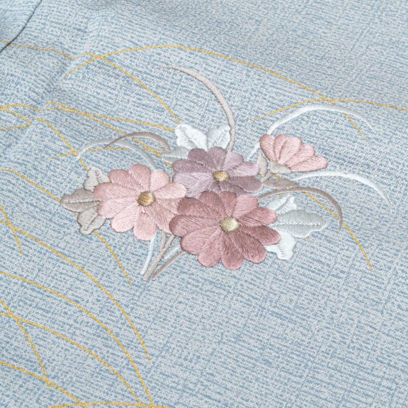 地紋の入った上質な生地に、金線で描かれた芝がやわらかな動きをつくり、ところどころに添えられた小菊と萩の刺繍が、静かな華やぎを添えています。