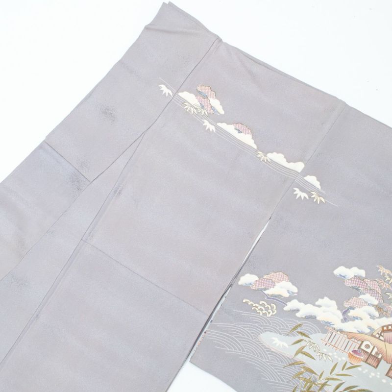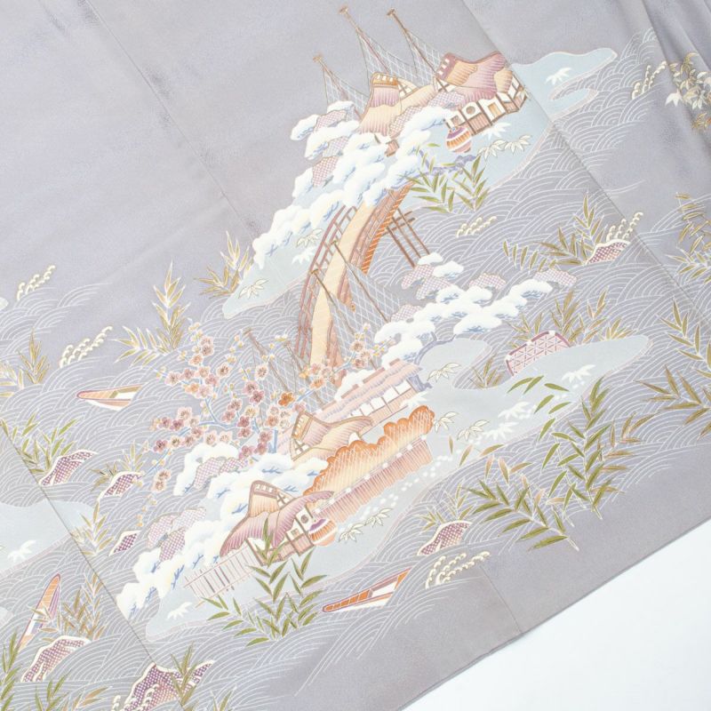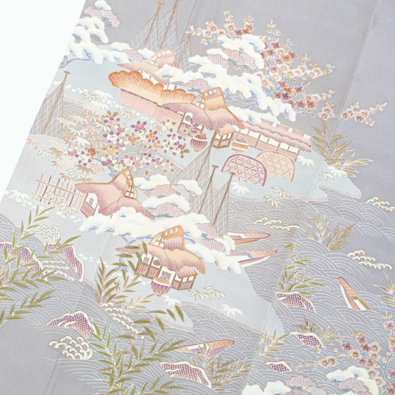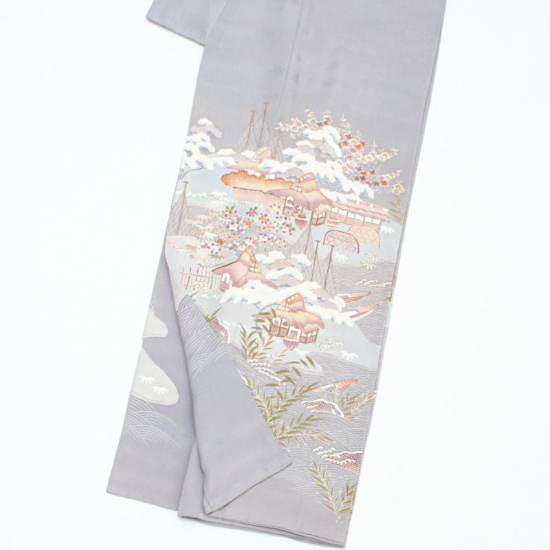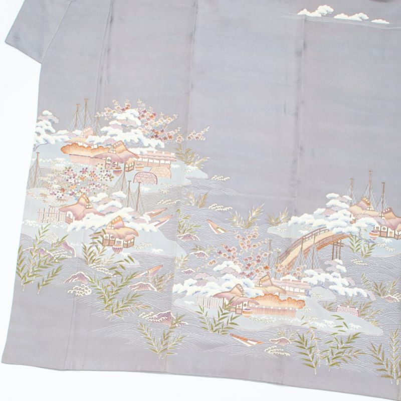 暁鼠(あかつきねず)の上品な地色に、雪景色の水郷風景を描いた友禅訪問着です。